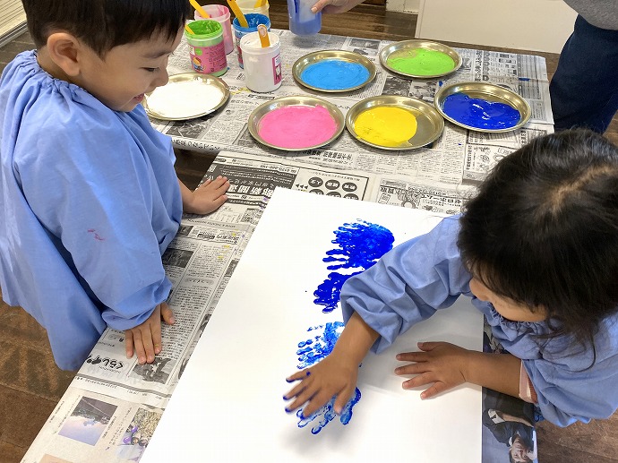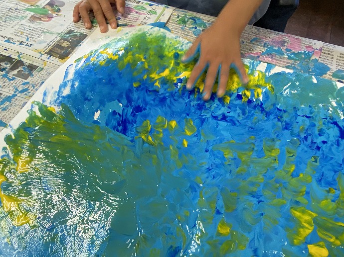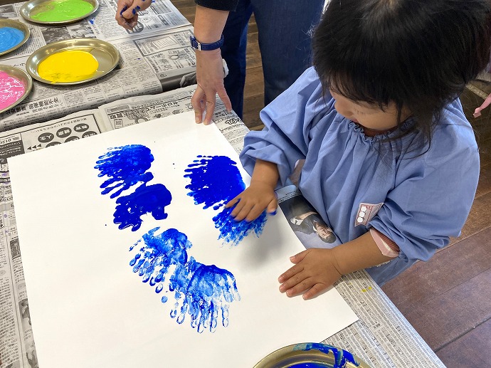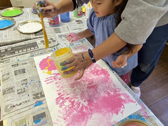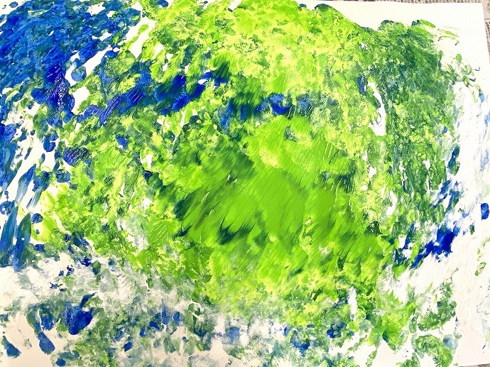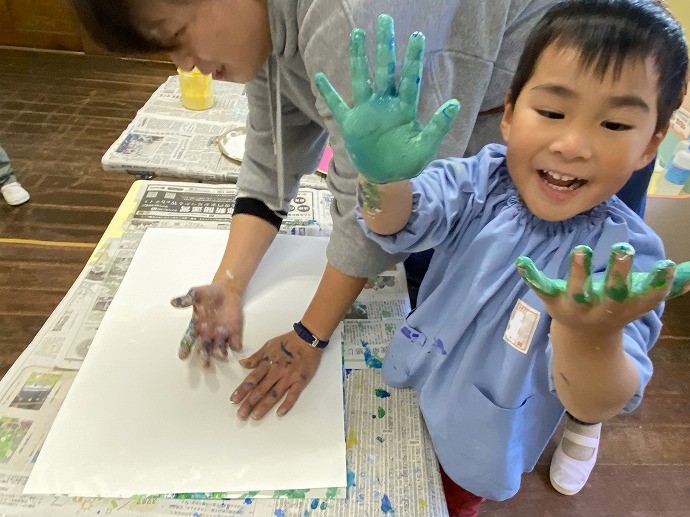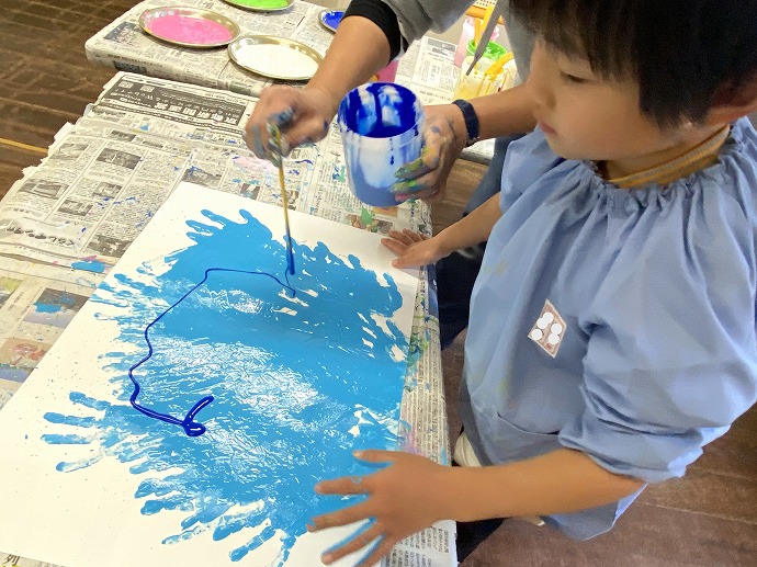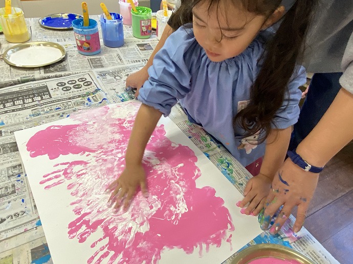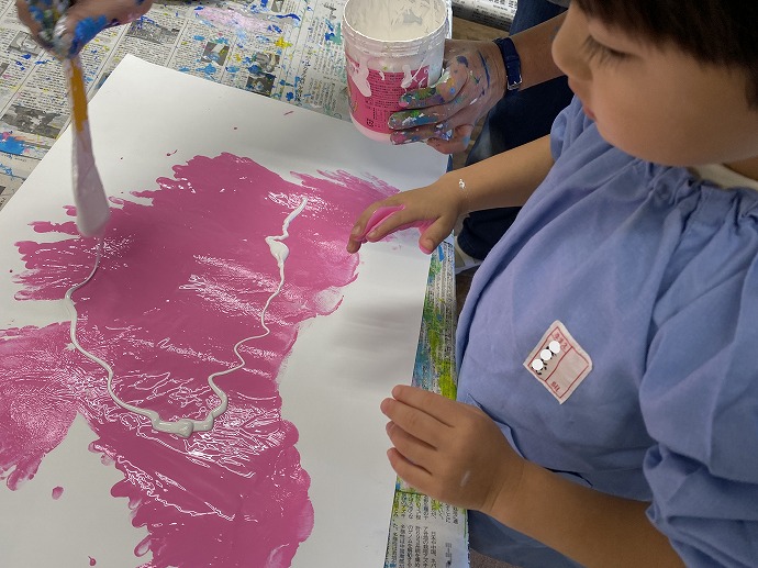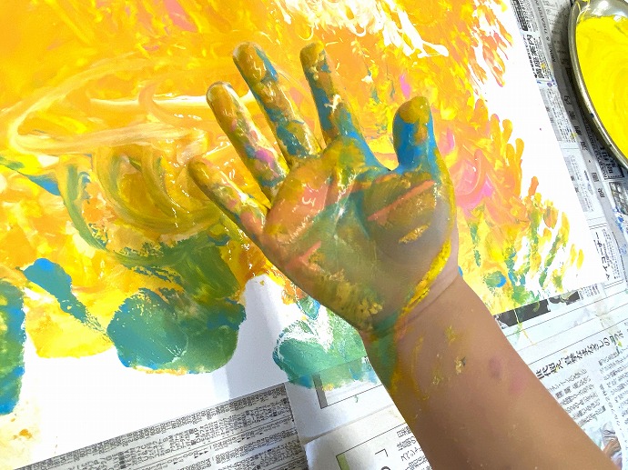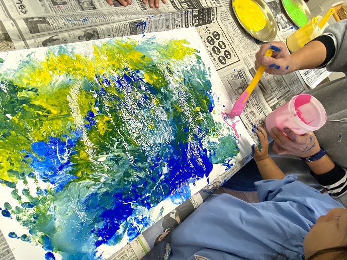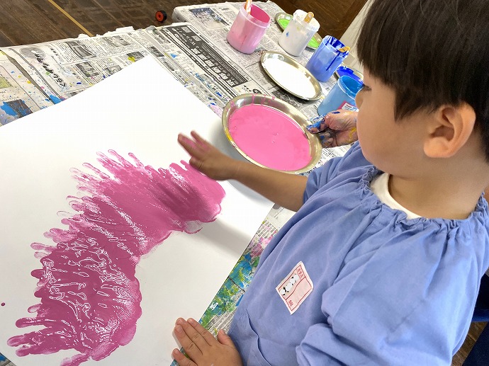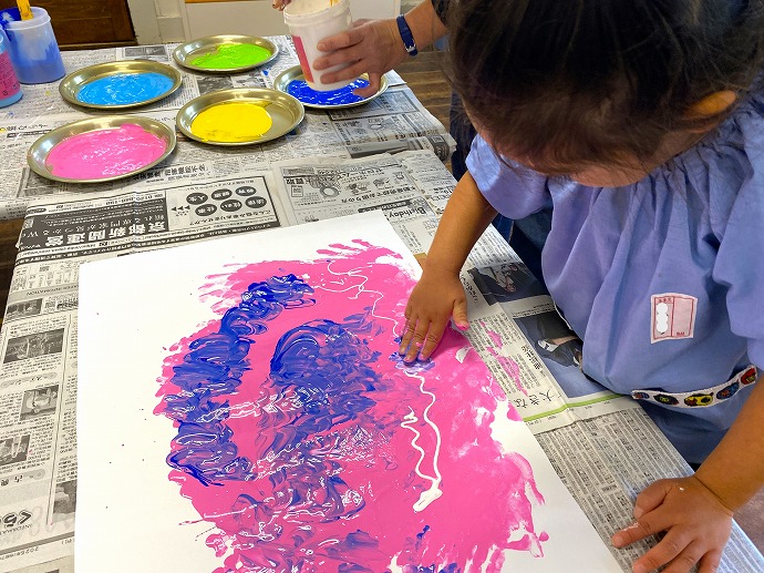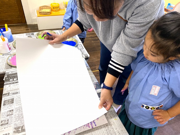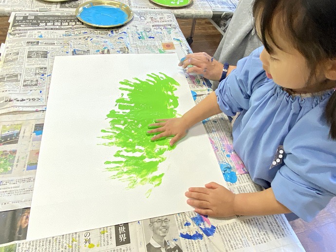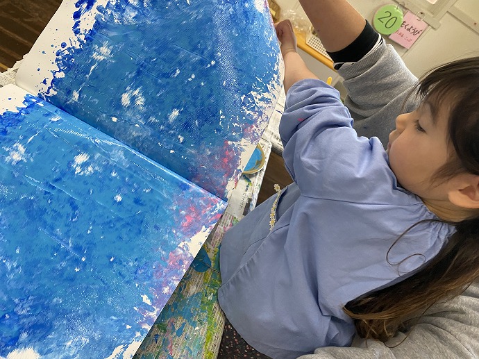 そこへ青色を選んで真ん中で混ぜてくるくる。絵の具に「糊」を混ぜているので伸びがよく、手の感触を気持ちよく楽しんでいます。「糊」を加えることは随分以前にtomomi先生と保育について話していた時、スライム遊びのように感触あそびも兼ねて気持ちよく取り組めるには?と考えついた方法です✨