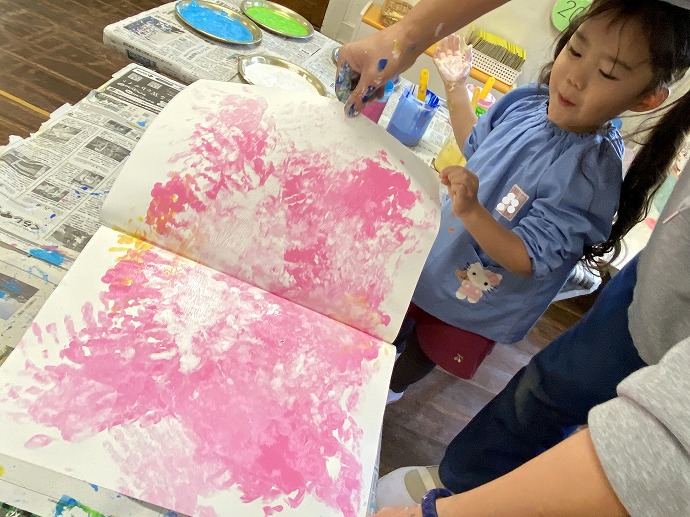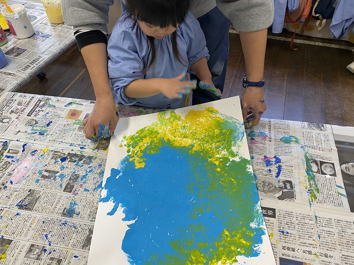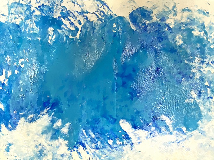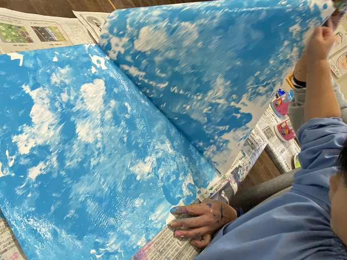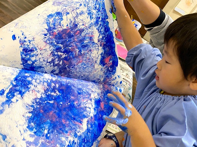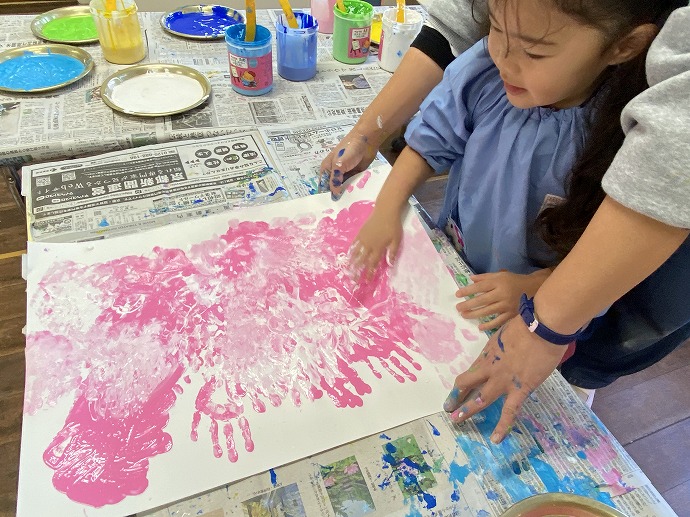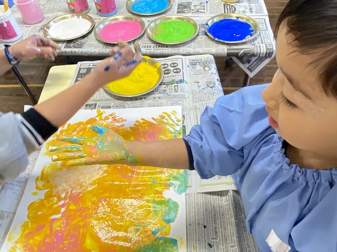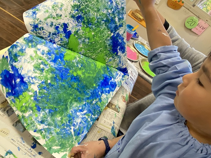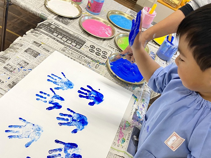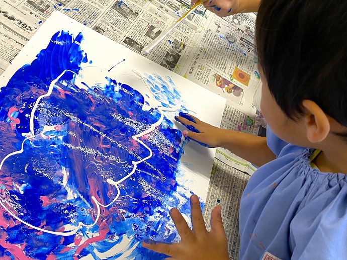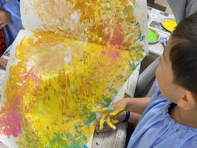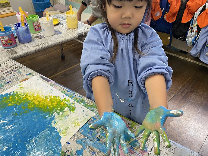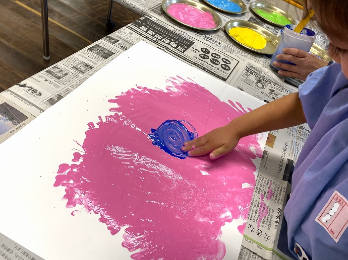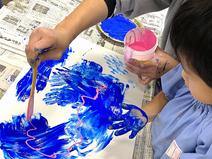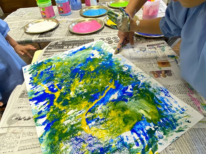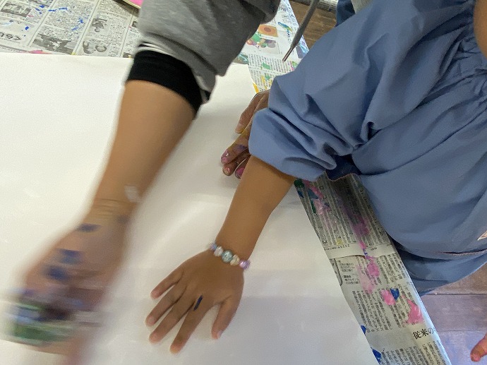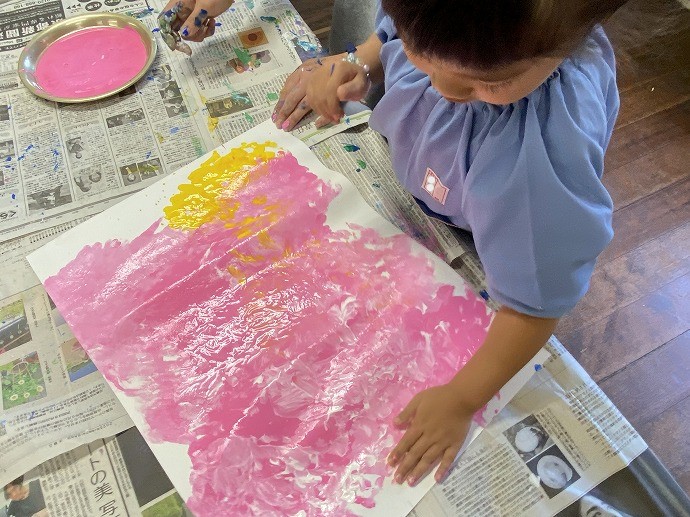 そこへ青色を選んで真ん中で混ぜてくるくる。絵の具に「糊」を混ぜているので伸びがよく、手の感触を気持ちよく楽しんでいます。「糊」を加えることは随分以前にtomomi先生と保育について話していた時、スライム遊びのように感触あそびも兼ねて気持ちよく取り組めるには?と考えついた方法です✨