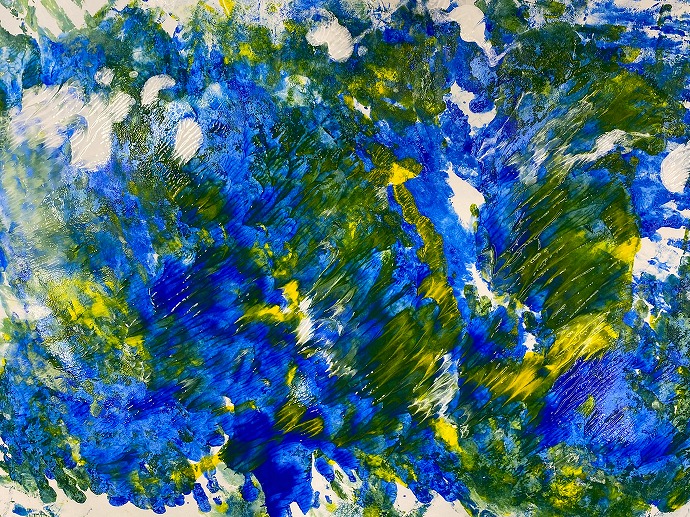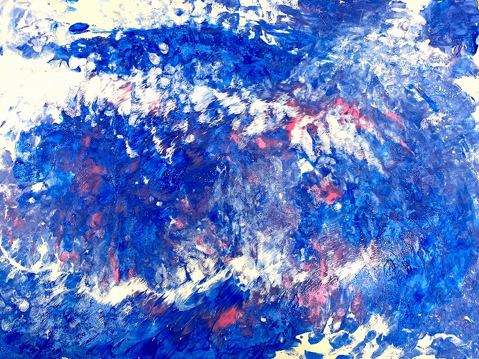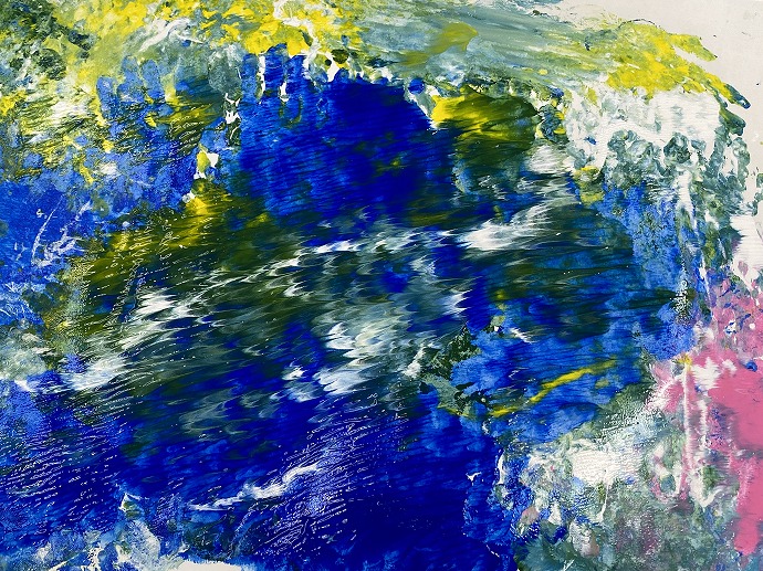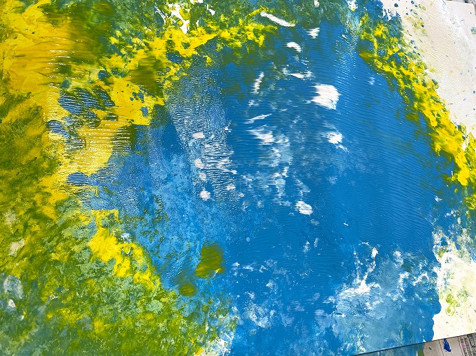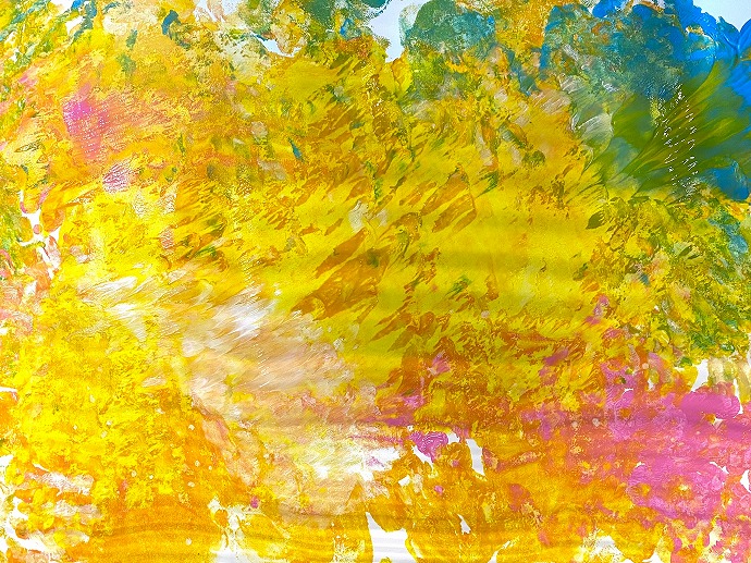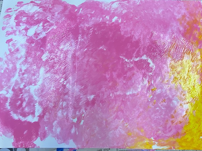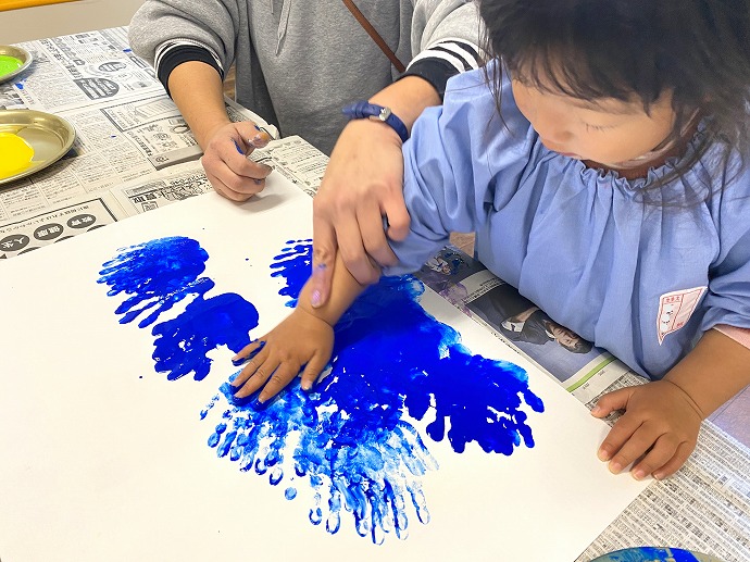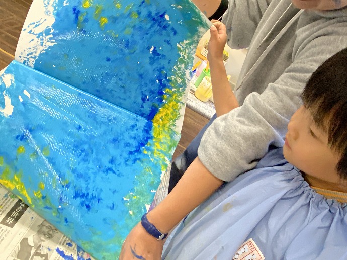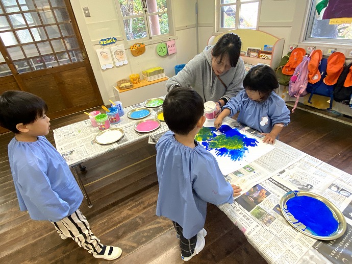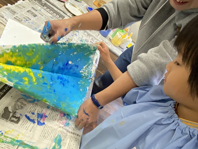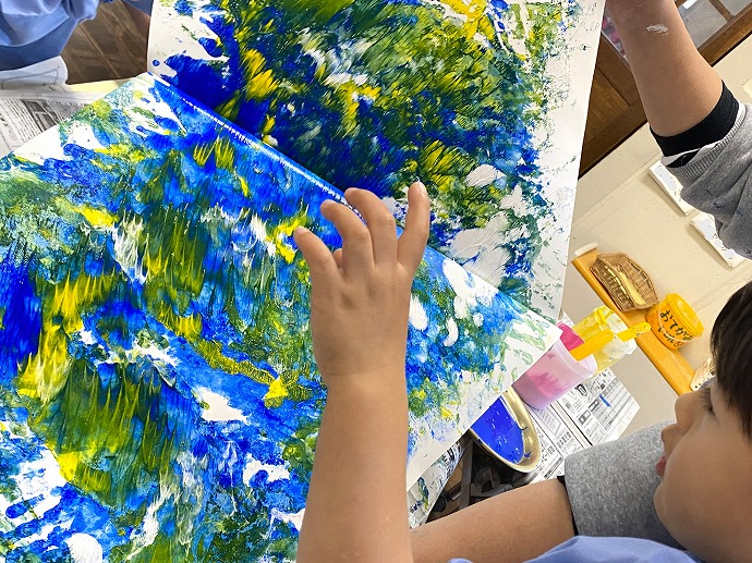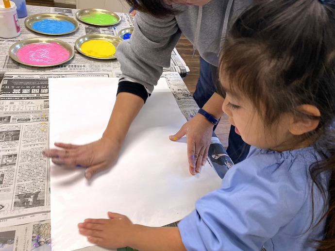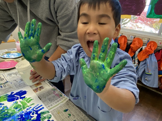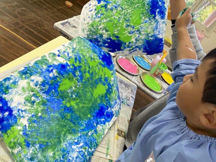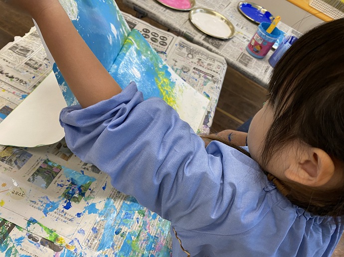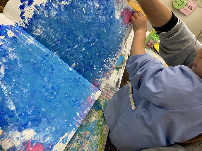 そこへ青色を選んで真ん中で混ぜてくるくる。絵の具に「糊」を混ぜているので伸びがよく、手の感触を気持ちよく楽しんでいます。「糊」を加えることは随分以前にtomomi先生と保育について話していた時、スライム遊びのように感触あそびも兼ねて気持ちよく取り組めるには?と考えついた方法です✨