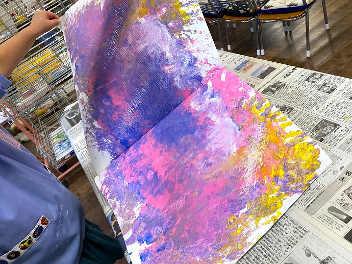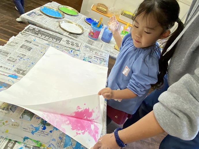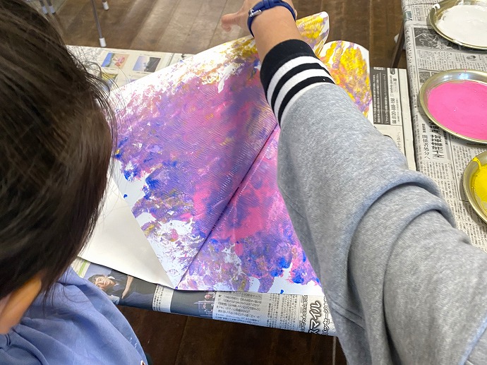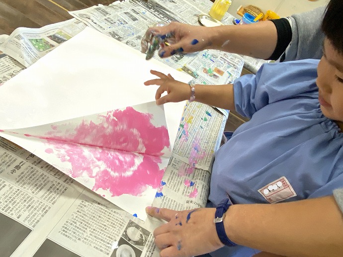 うわ~✨綺麗💕 もう片方の紙に色が写り、不思議な模様が出てくる様子はいつ見ても美しくワクワクします。間近で目にする子ども達の驚きと感動が伝わってきます✨