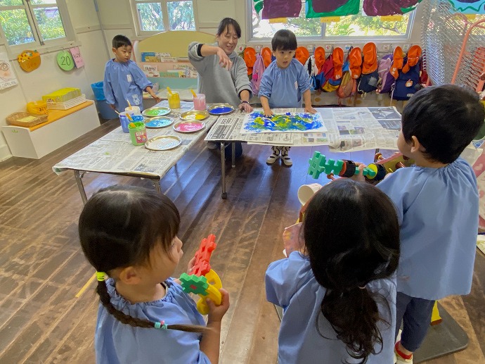 この日、年少クラスは外遊びから帰ってきたあと11時~クリスマス帽子🎄の製作を行いました。まずはハンドペインティング、続いてデカルコマニーで仕上げます。デカルコマニーはフランス語の動詞「décalguer 転写する」からくる言葉で、色の混ざり具合や模様の不思議さを楽しみながら創造性を育む技法の一つで保育ではよく取り入れます。