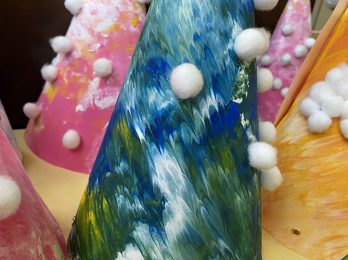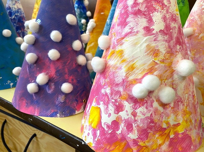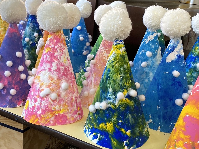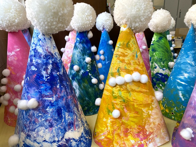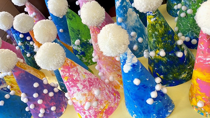 ハンドペインティングとデカルコマニーでつくったクリスマス帽子🎄 どれも鮮やかな色合いに💜