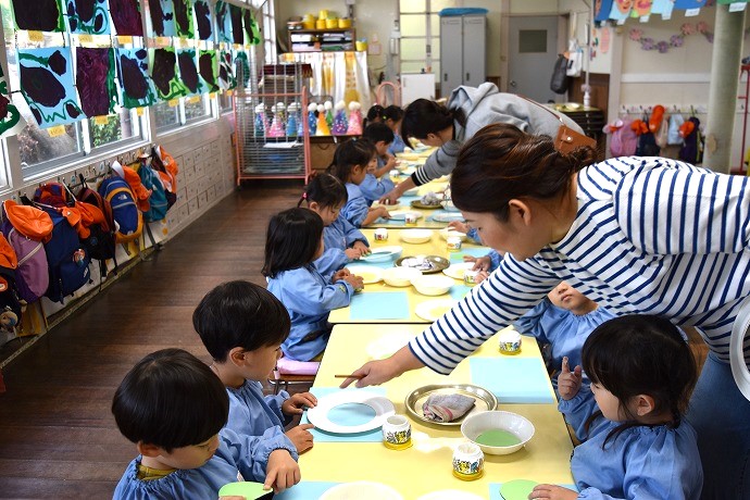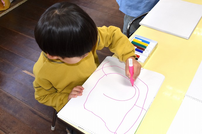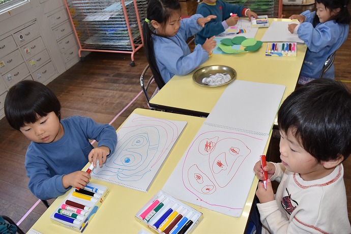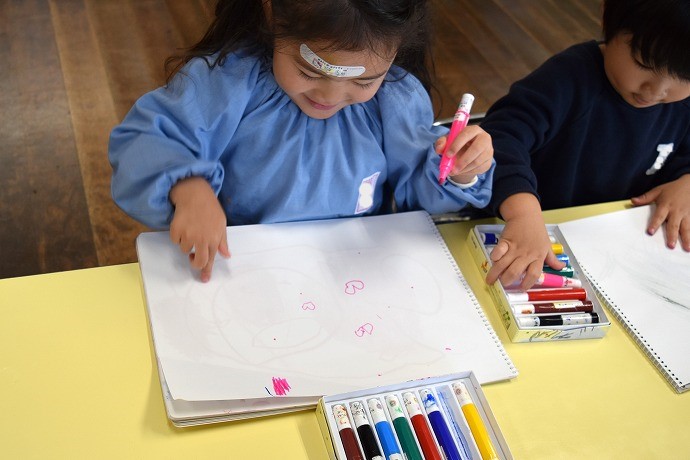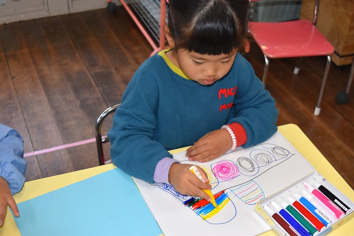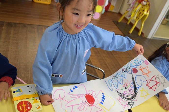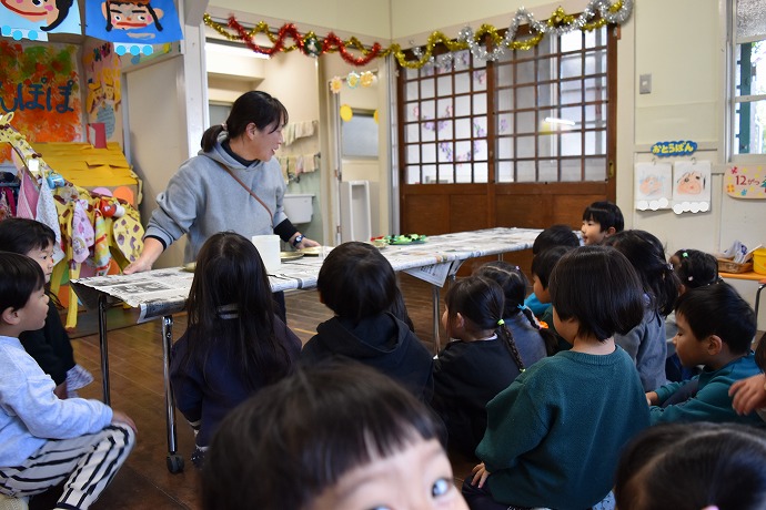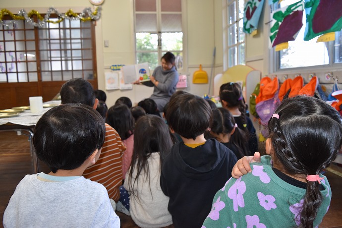 お外遊びから戻ってきたら手を洗ってお仕度ができたらmami先生の絵本がはじまります。お話の世界に聞き入る子ども達。みんなは絵本、紙芝居が大好きです。