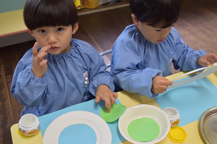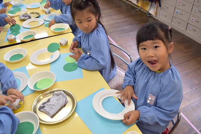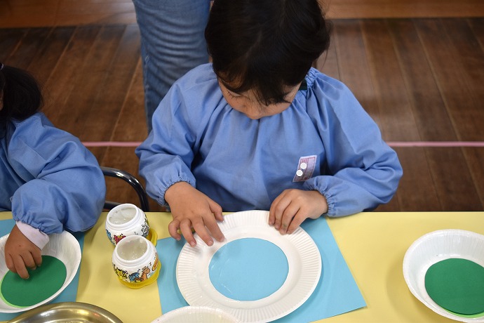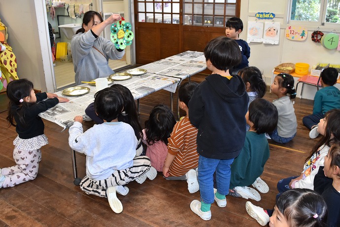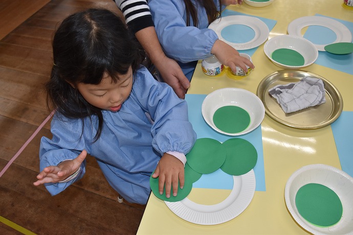 真ん中をくり抜いた紙皿を前にmami先生、tomomi先生から教えてもらいます。まずクリスマスリースになる紙皿の白い部分に手でのりをぬっていきましょう。中央にクリスマス🎄のおねがいごとを書いたカードをぶら下げる予定です。