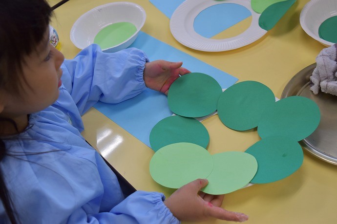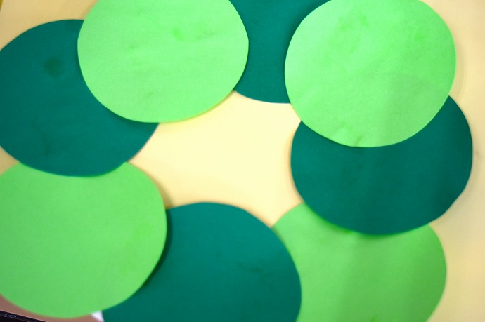 ここにのりを。そして塗れたら丸い紙にも順番にのり付けしながら貼っていきます。