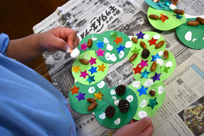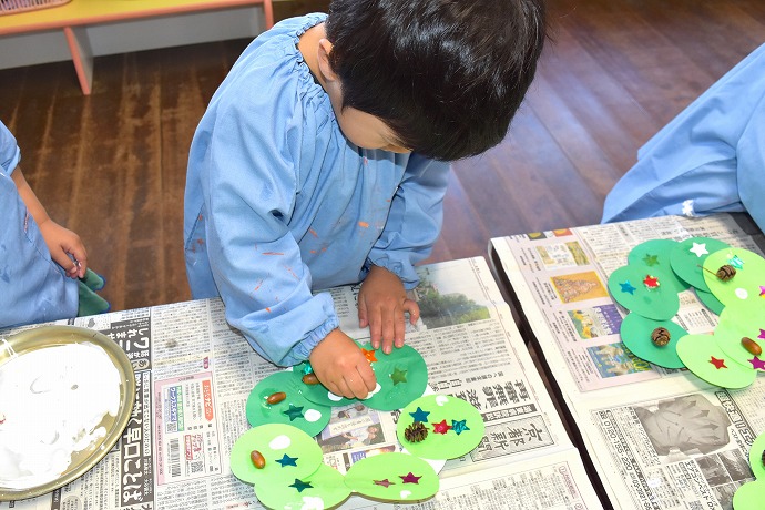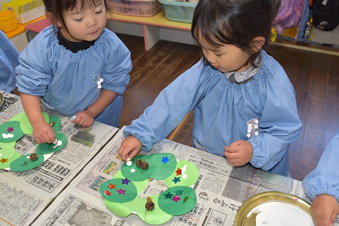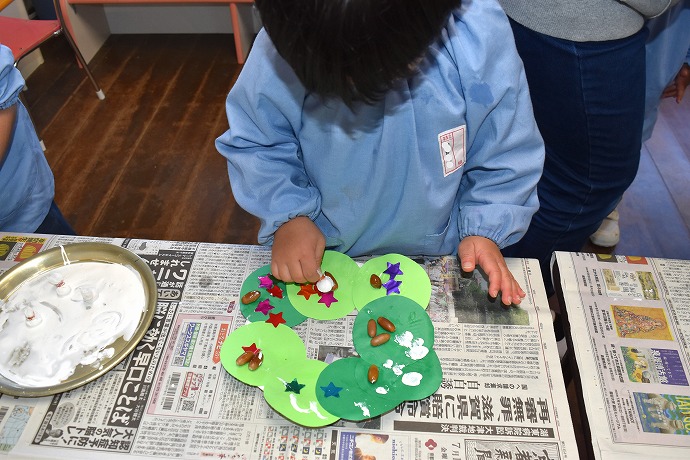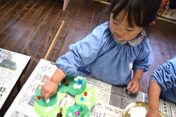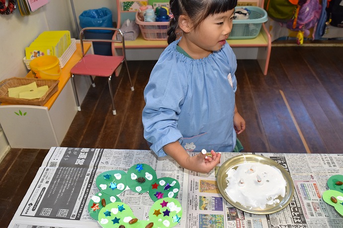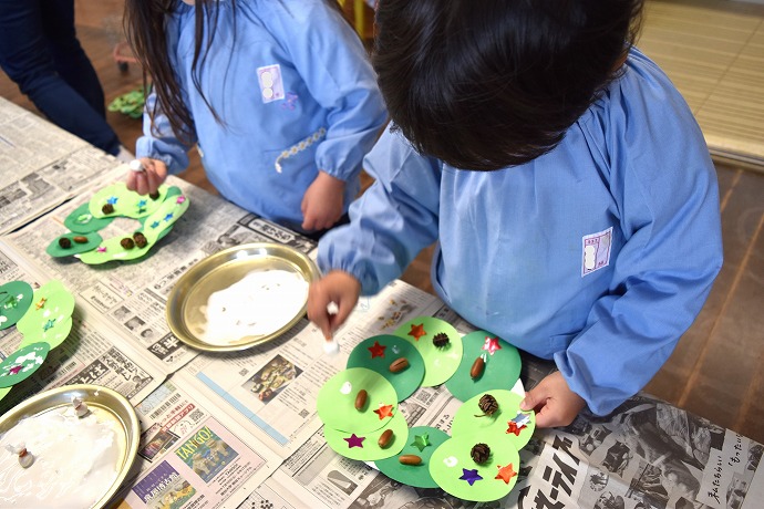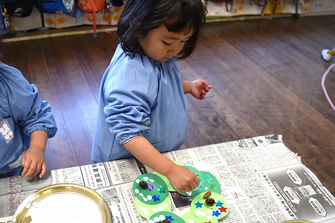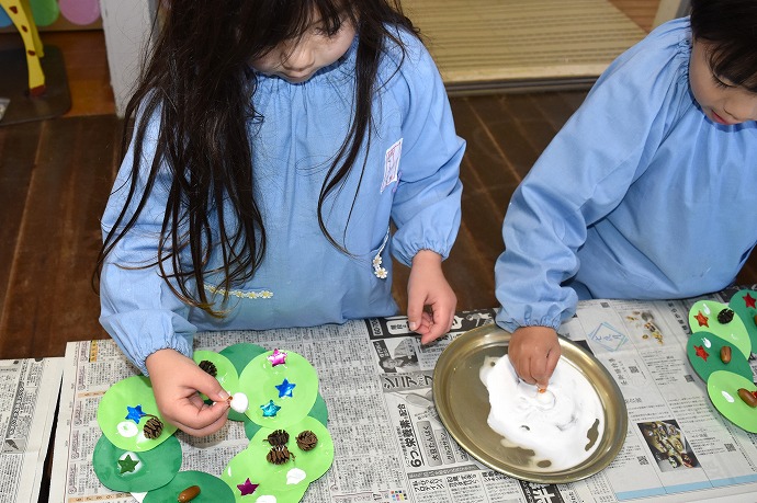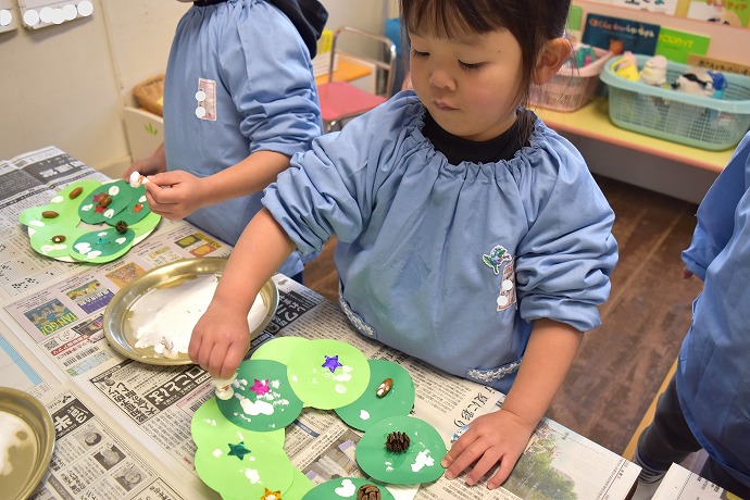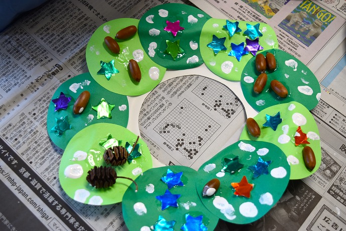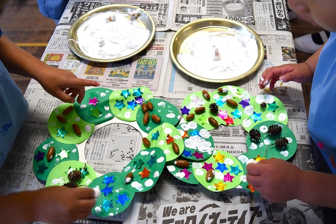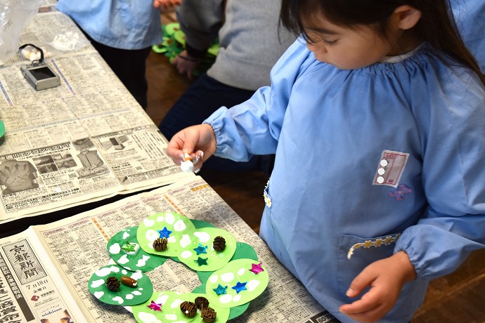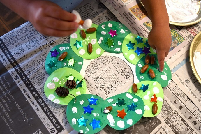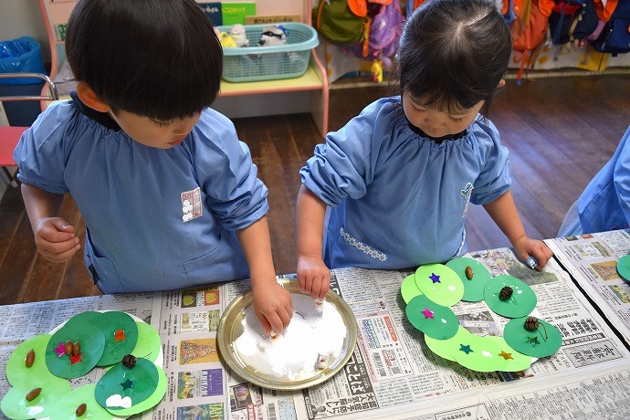 みんながこの前つくったクリスマスリースの仕上げをしましょう。ドングリやメタセコイアの実もつけたので最後に小さなタンポで白い雪をつけてあげましょう。トントントン、あっちにも、こっちにも雪をつけてみました。