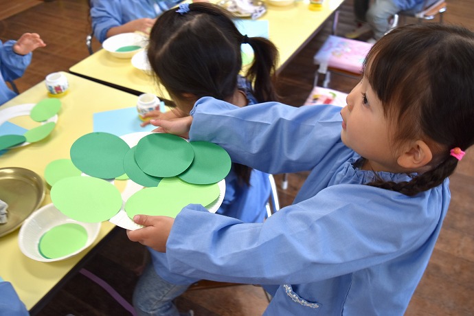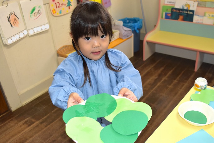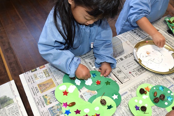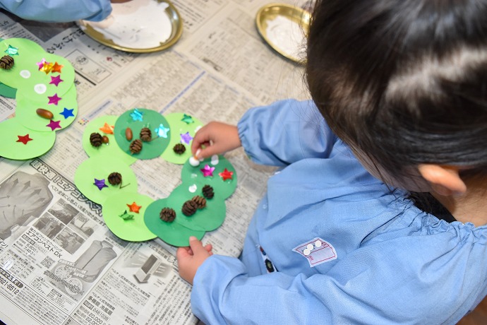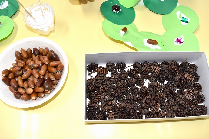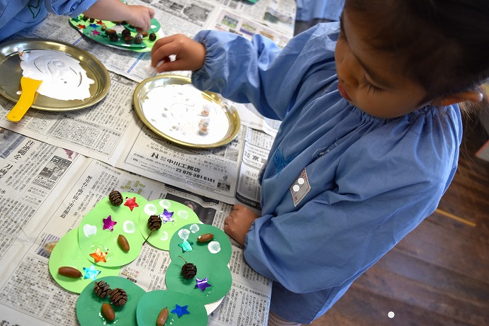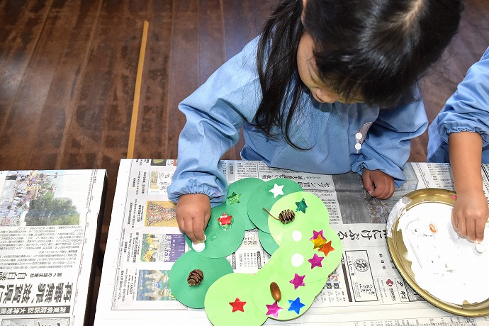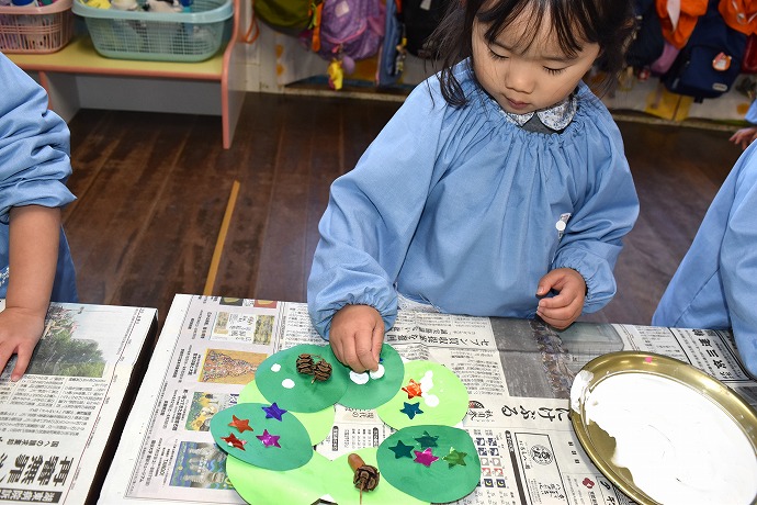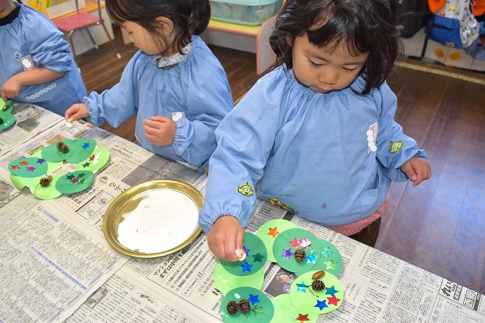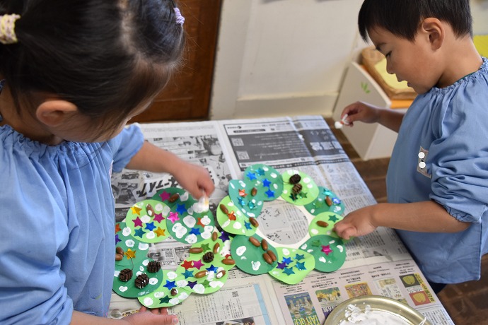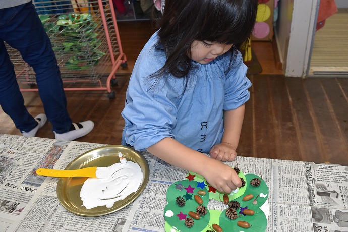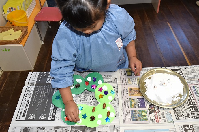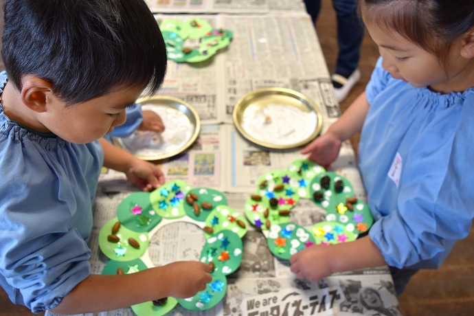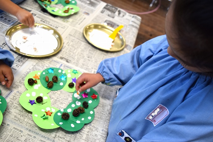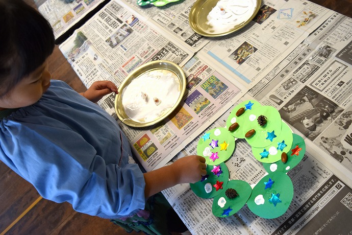みんながこの前つくったクリスマスリースの仕上げをしましょう。ドングリやメタセコイアの実もつけたので最後に小さなタンポで白い雪をつけてあげましょう。トントントン、あっちにも、こっちにも雪をつけてみました。