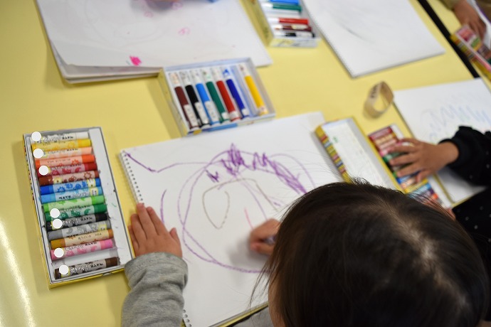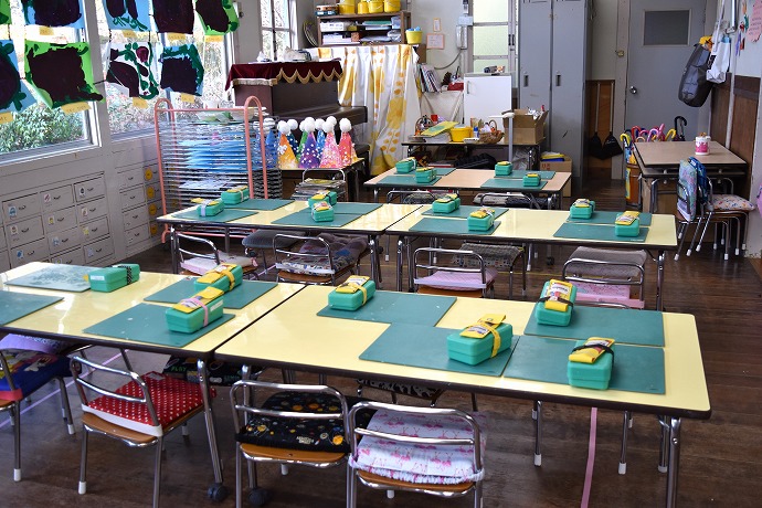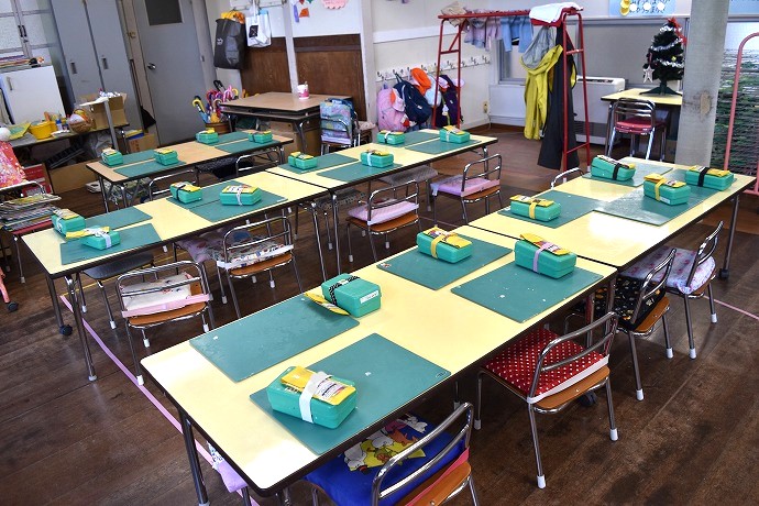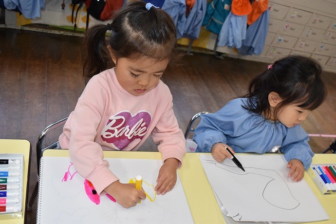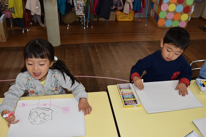 次は12/4(木)。お外あそびからクラスに帰ってきた年少クラス。先生もいくわね!