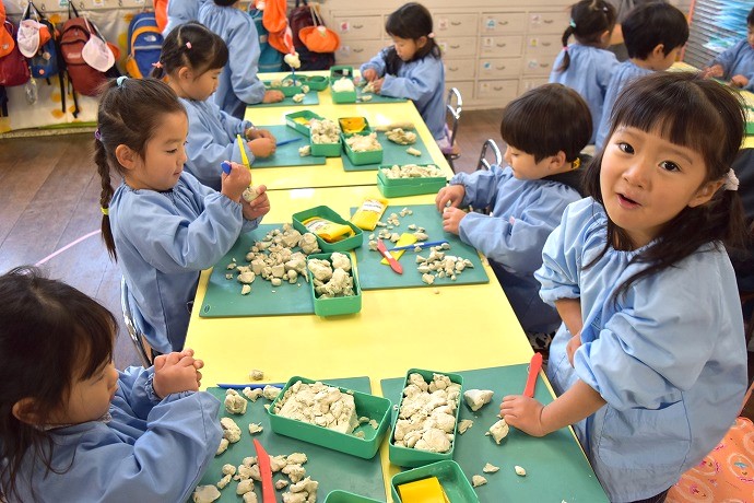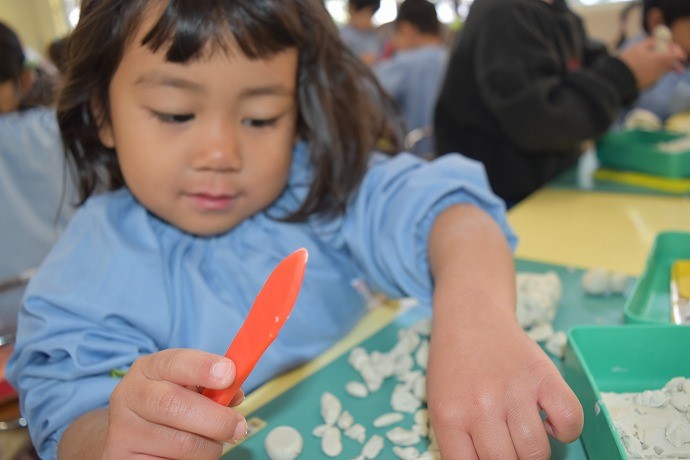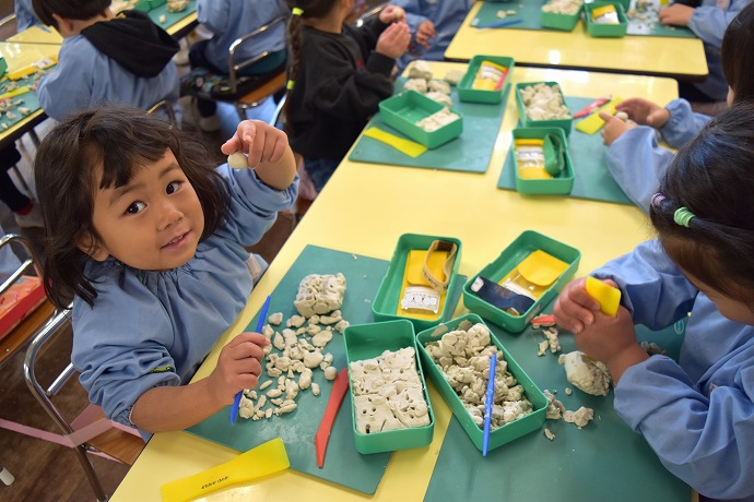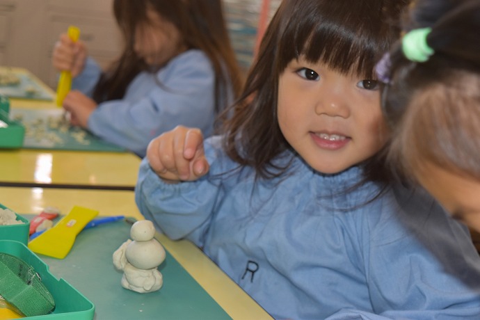 粘土板の上で続いて作業をする子ども達。お砂場あそびと同じく粘土あそびは手指を使って五感を刺激し、手先が器用に動かせるようになることで脳の発達につながります。こねたりちぎったり、丸めたり。細かくヘラを使いながら集中力と達成感が育まれ、リラックス効果で心の安定にもつながる粘土あそびが子ども達は大好きです。