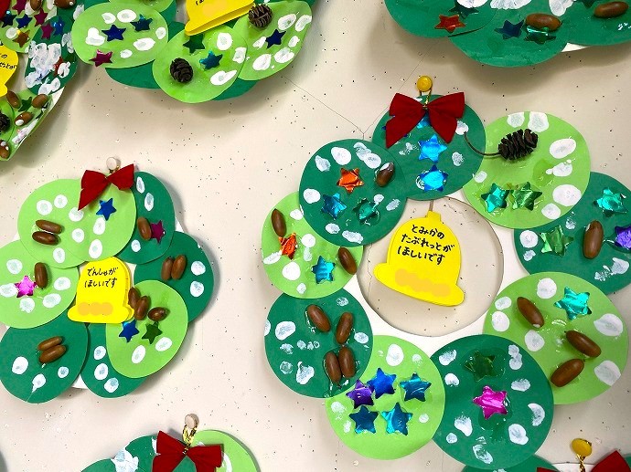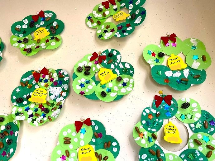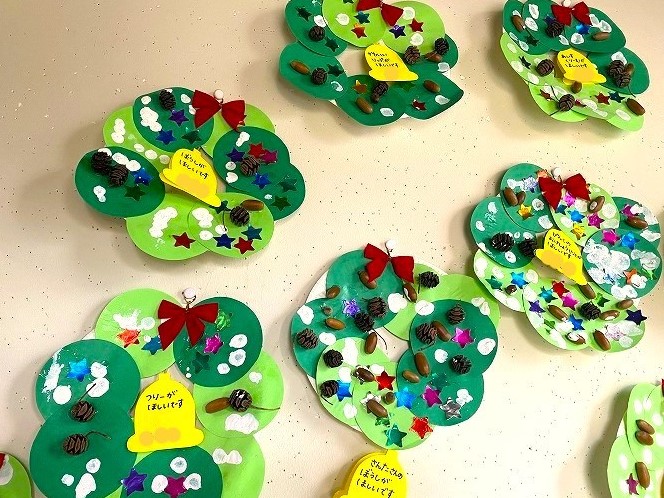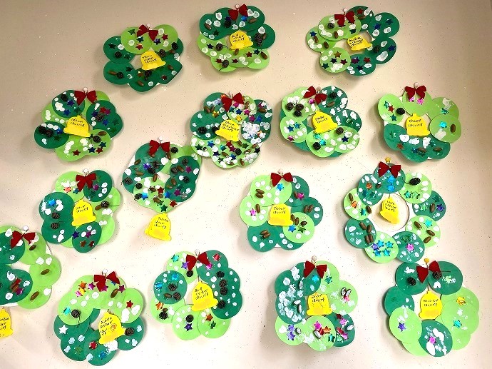 クラス壁面に飾ったクリスマスカードとリース🎄