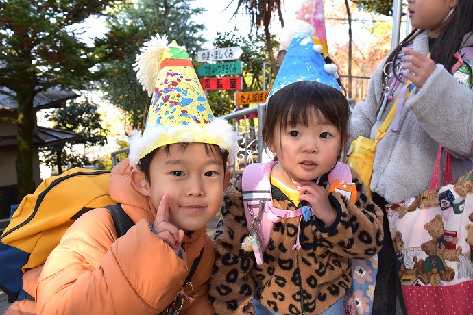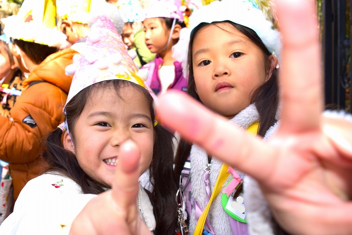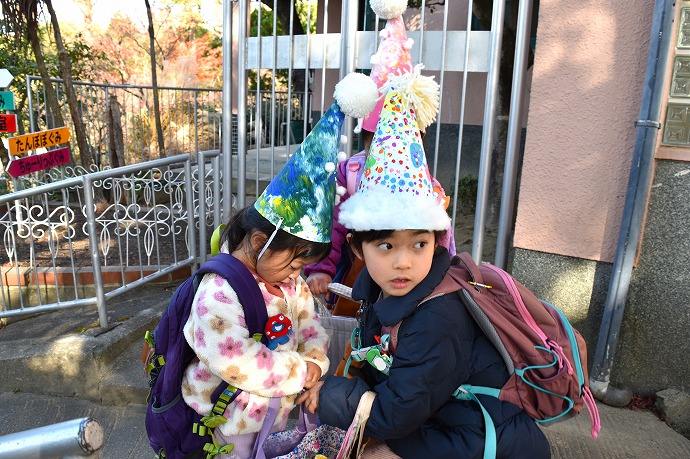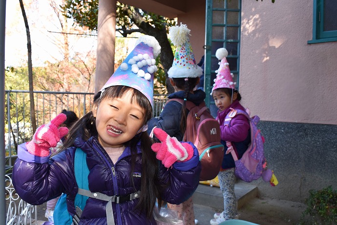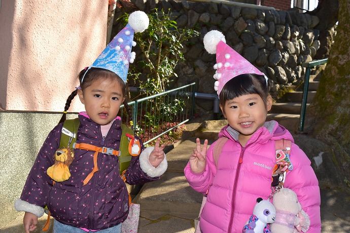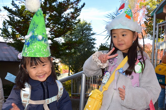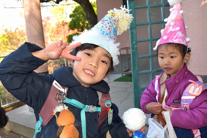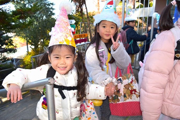準備ができた年少クラスのMちゃんNちゃん。素敵なクリスマス帽子🎄で帰ります。ピース✌✌