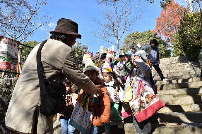 山の上からの景色を見て「ほう!」と一声あげてから、階段を一段ずつおりて年長クラスの園舎へむかわれました。