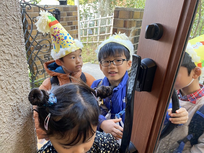 「ここがゆきぐみだな。よい子にしてるかな」とドアをノックしてメッセージを英語で伝えると…子ども達は驚きつつも大喜び✨