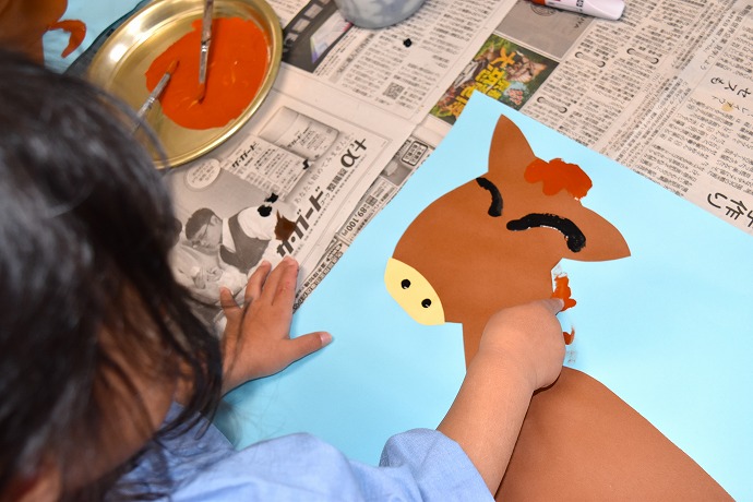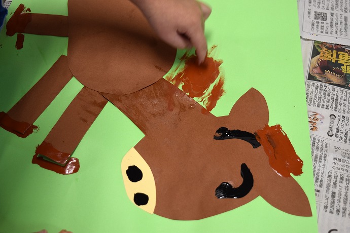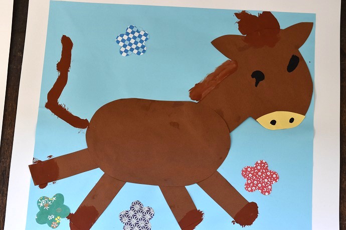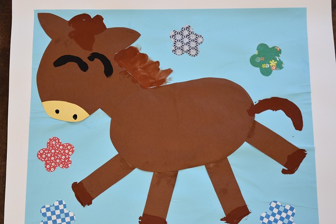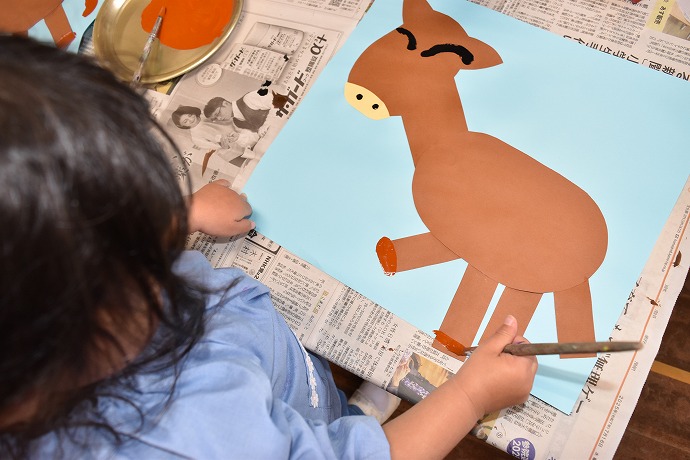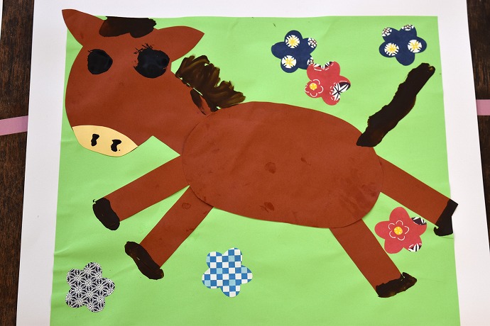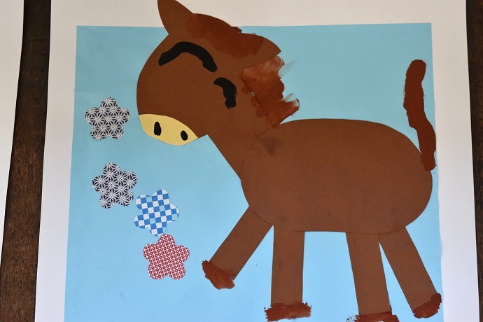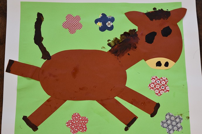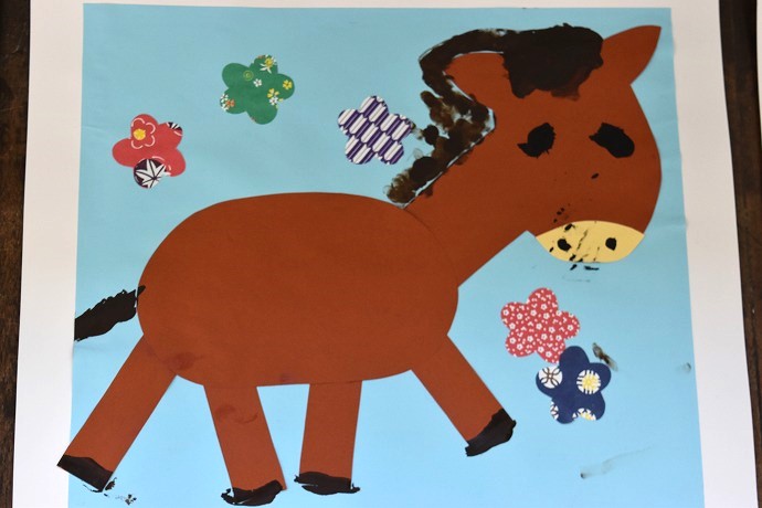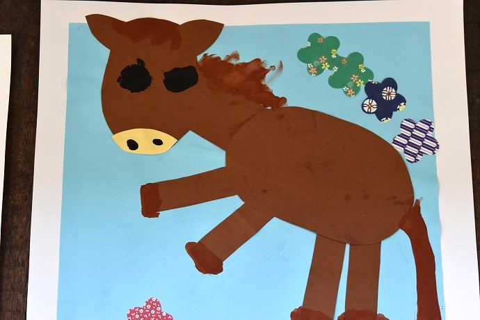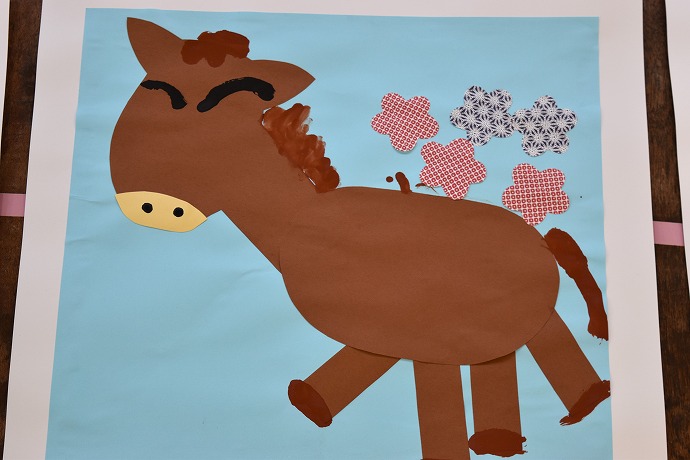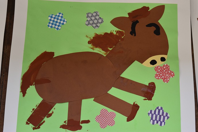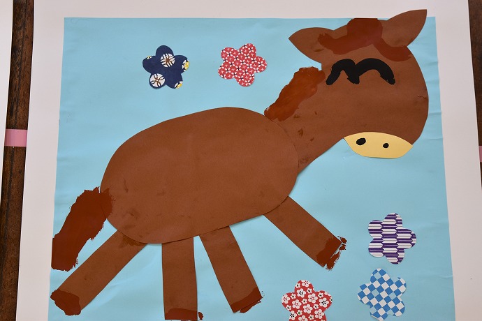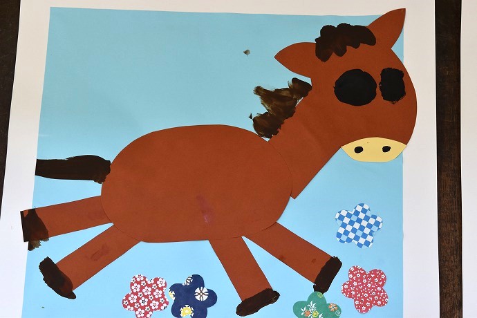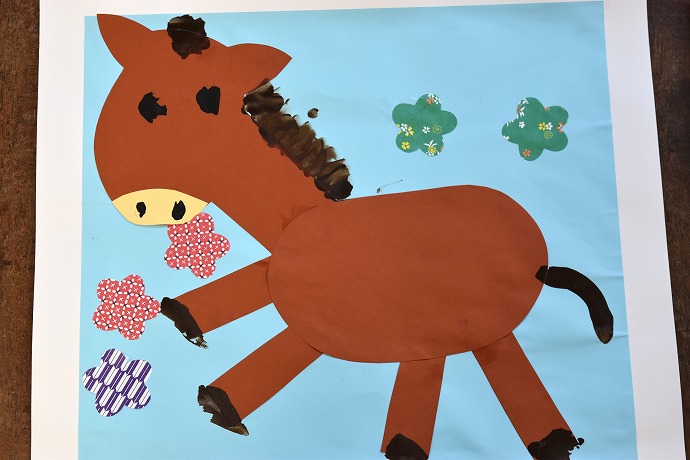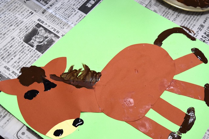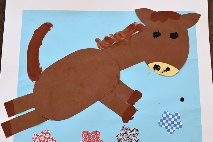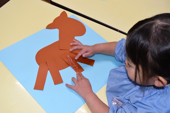 お馬さんの顔、体、手足にわかれて予めカットされたバラバラのものを自分なりに考えてパズルのように作り上げていきましょう。