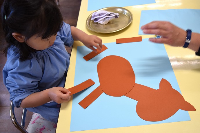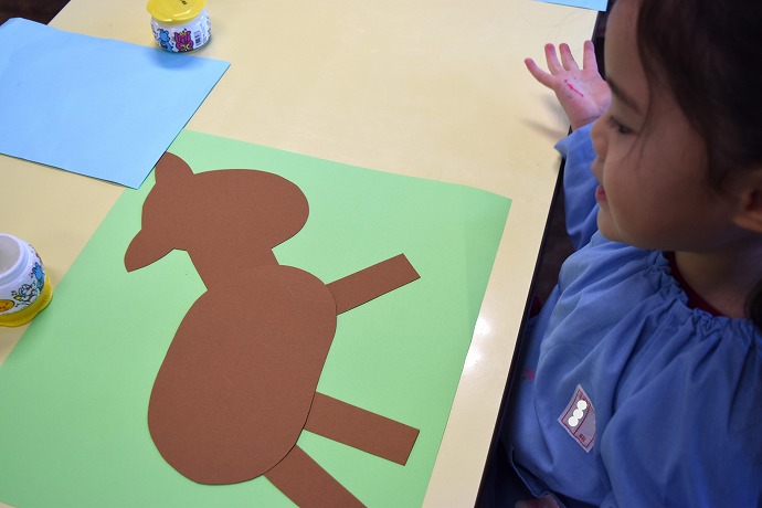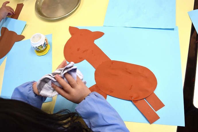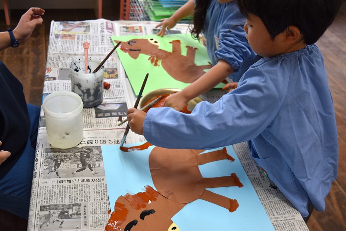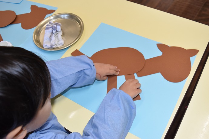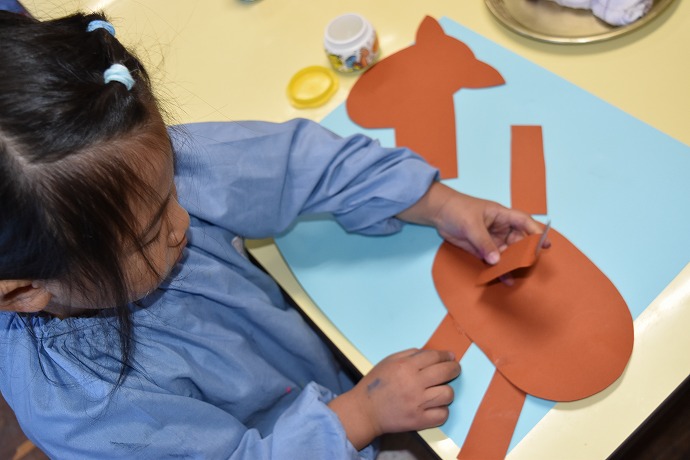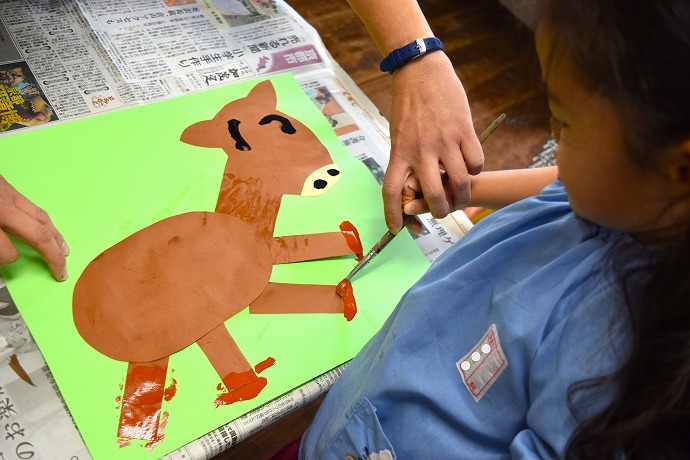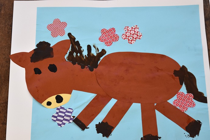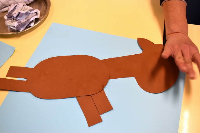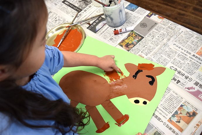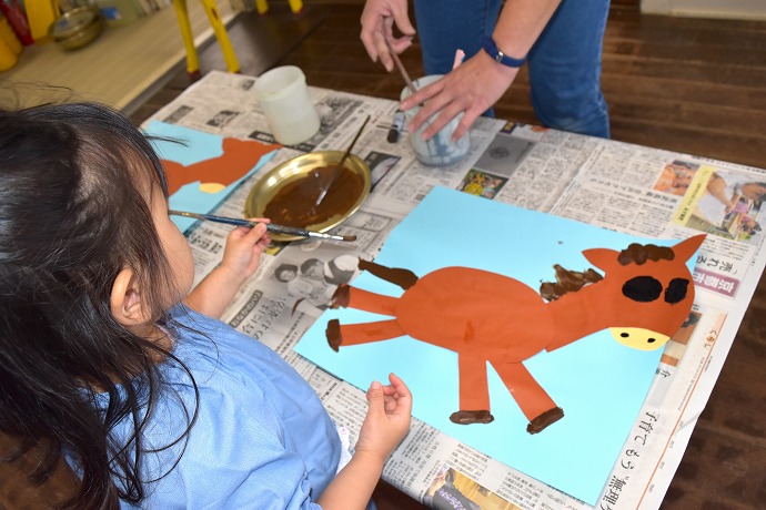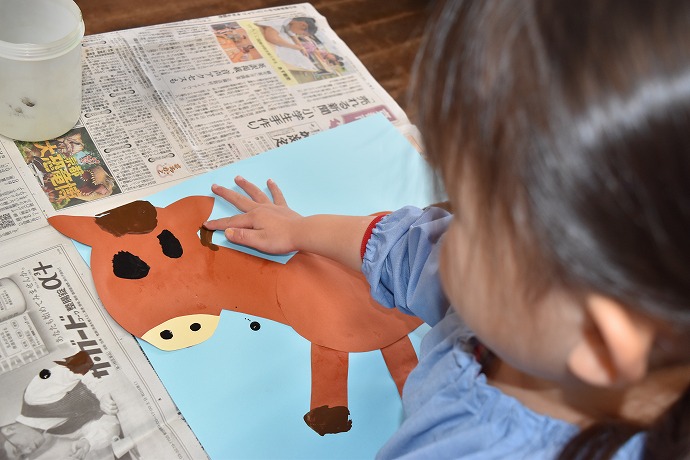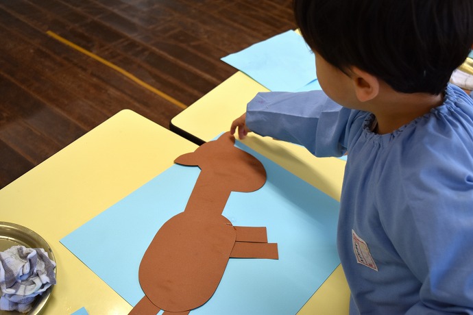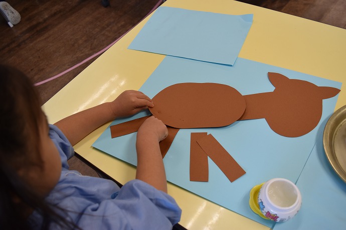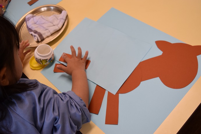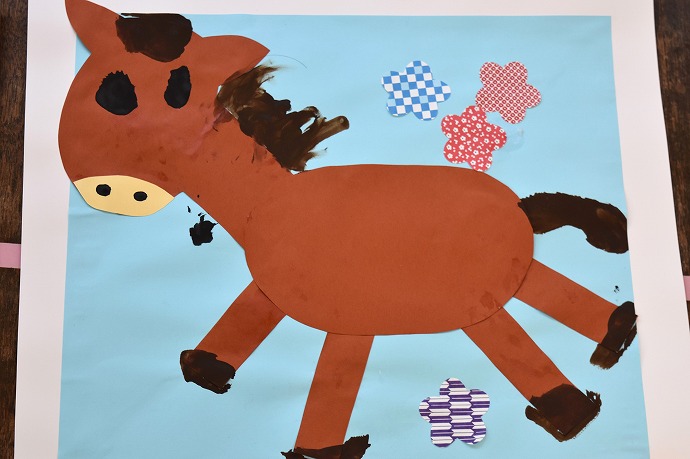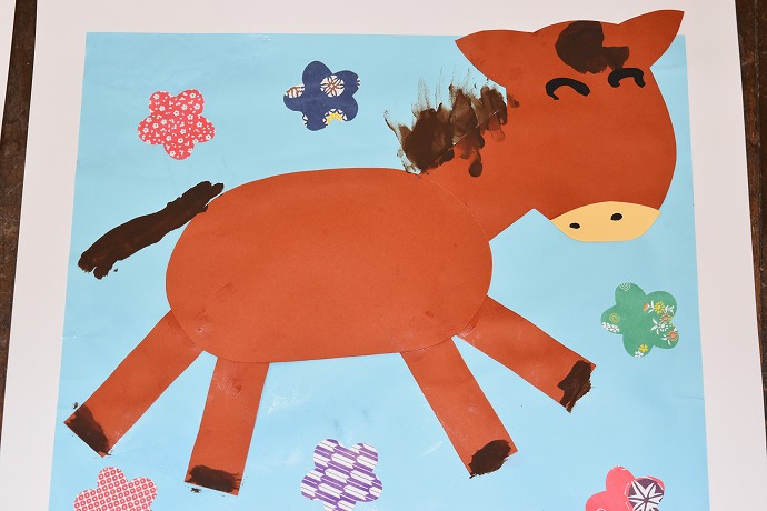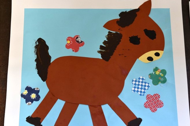 お馬さんの顔、体、手足にわかれて予めカットされたバラバラのものを自分なりに考えてパズルのように作り上げていきましょう。