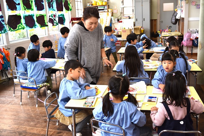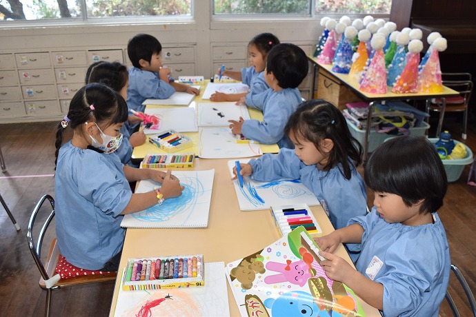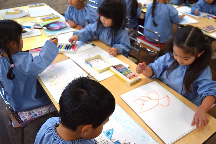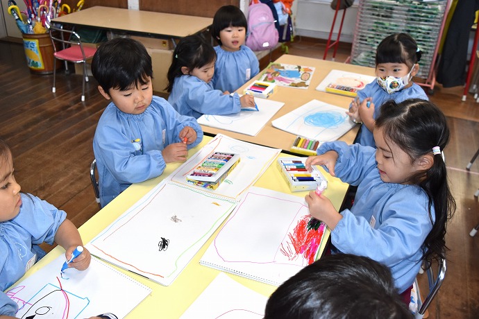 こちらは自由画帳にお絵描き中のグループ。順番を待ちながら楽しいとき。
