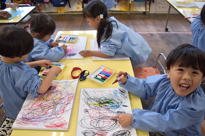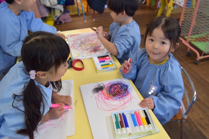 「なぐりがき」。色、手指の動きを楽しみながら、ぐるぐるうずまき🌀を描いたり、お話しながら手を動かして表現を楽しみます。サインペンやクレパスで握る感覚も大事です。