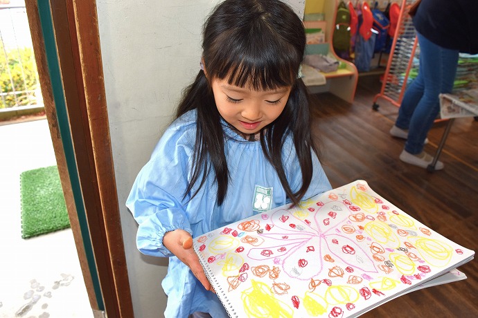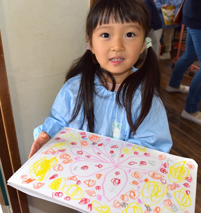 自由画帳いっぱいのお花を描いたMちゃんがきて見て!と💕