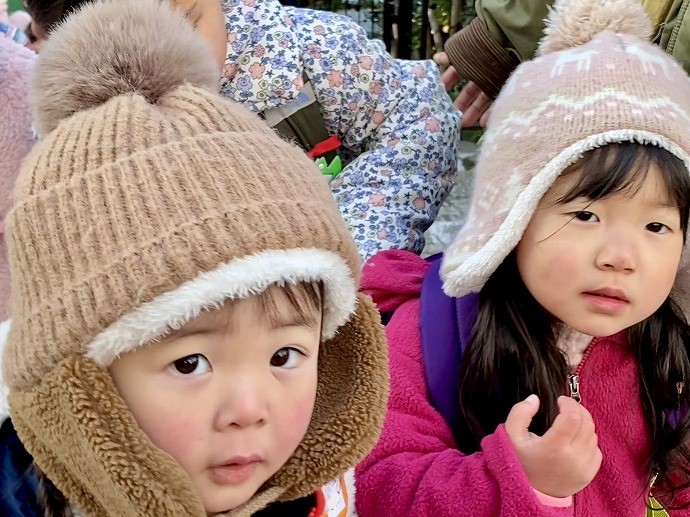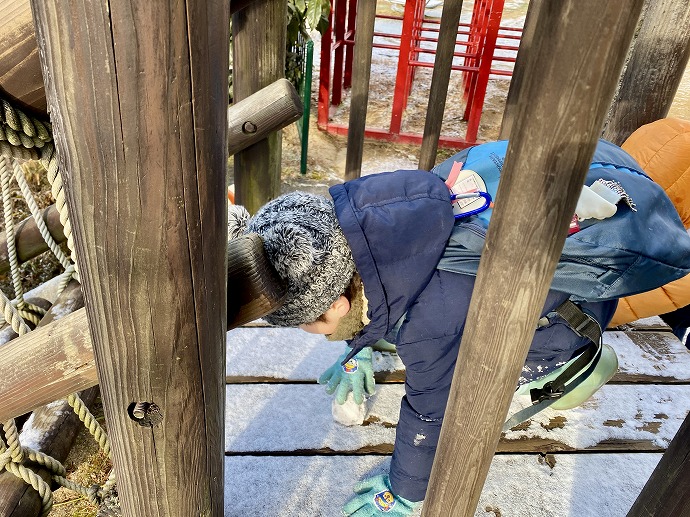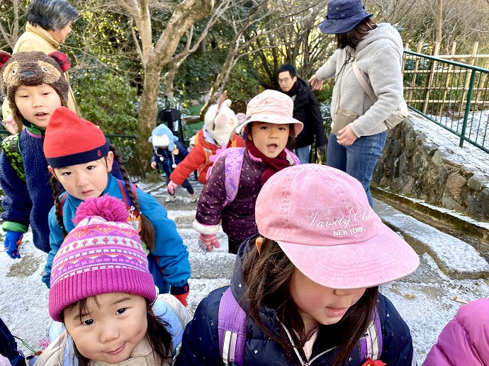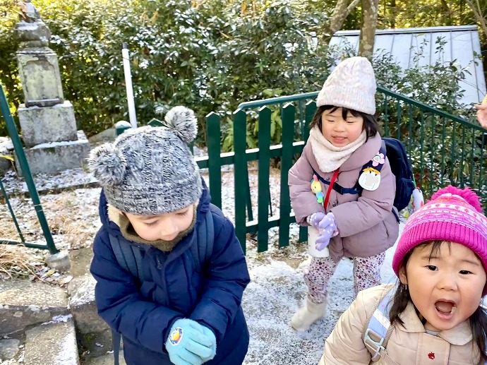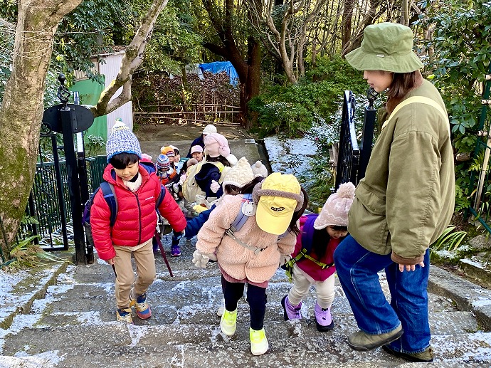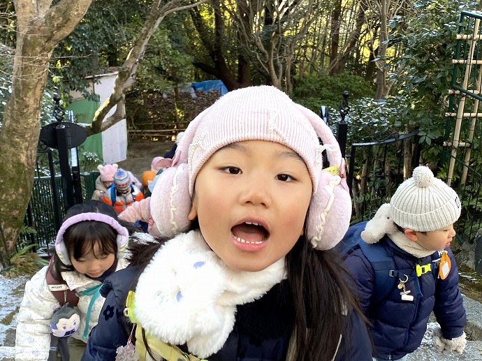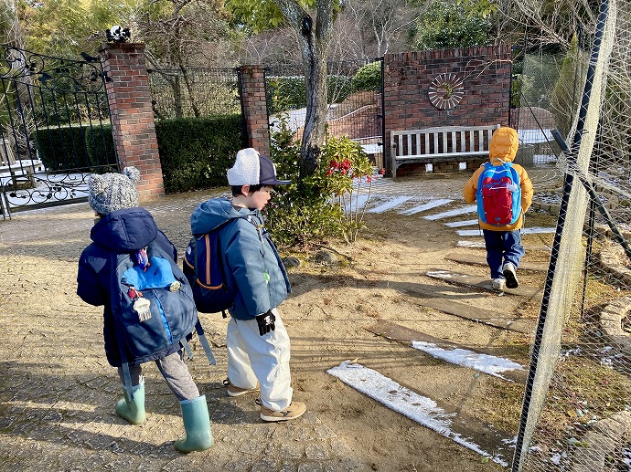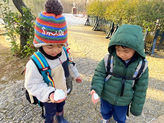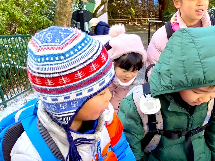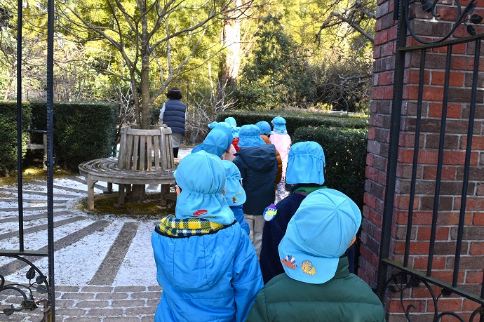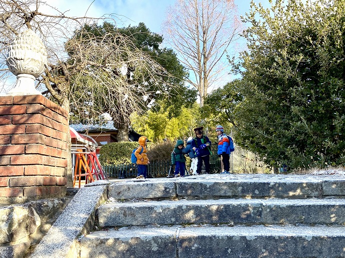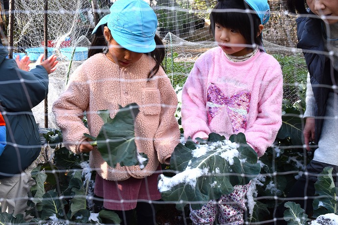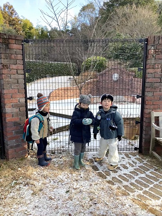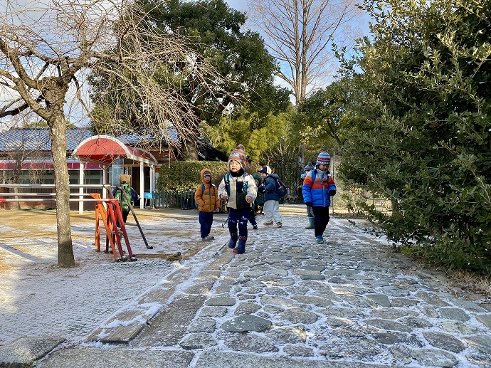 今朝は9時の時点で気温1℃。園内交通安全教室を終えてから年中クラスがひみつの庭の畑に向った時刻は気温2℃ほど。きりりと引き締まった気持ちのよい空気です。