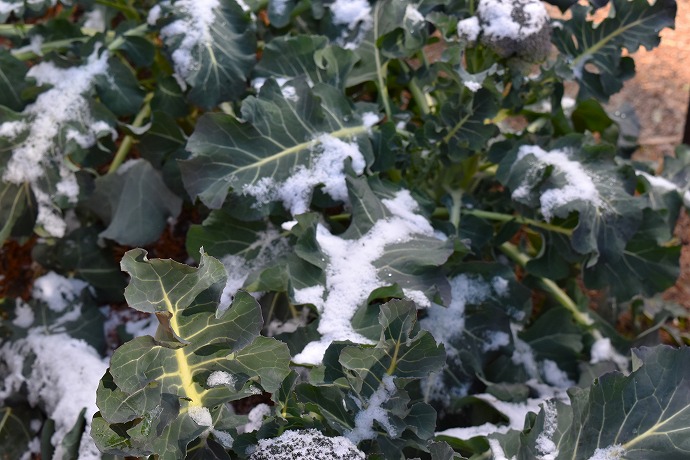 すくすく育ったブロッコリーの葉っぱ。そう言えば、秋にはショウリョウバッタがやってきたり、ある種の細い幼虫がたくさん葉っぱについていたので、みんなで幼虫の捕獲作戦をした頃もありました。