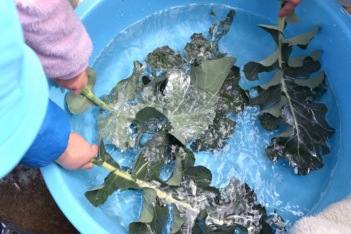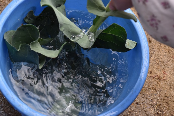 そんなメタセコイアの下で子ども達はブロッコリーの葉をサワサワと水の中をくぐらせて洗っています。