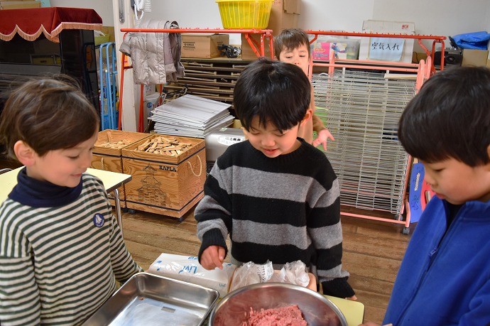 クラスに戻り、挽き肉をボウルに出して準備をしていると「このふわふわのお肉はぼくはすきなんだよ!」とKくんが言います。よかったね、美味しいお料理をみんなでつくりましょう!