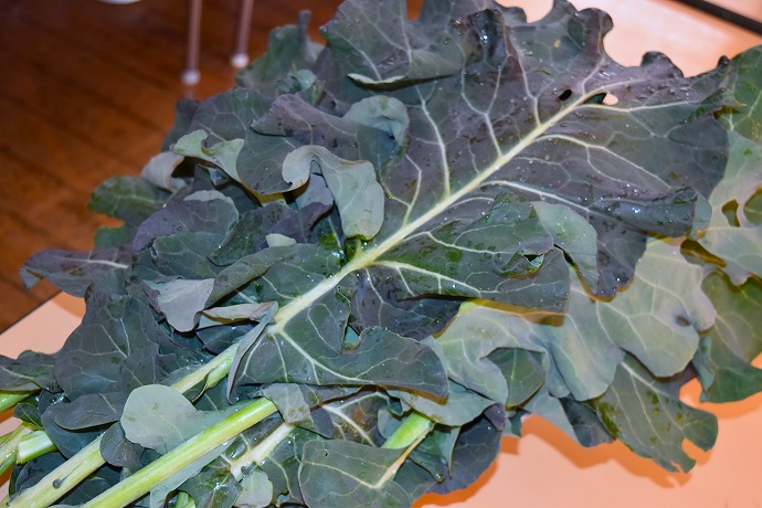 収穫した葉を手に。葉っぱに雪が積もった記念日の収穫となりました。
