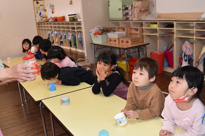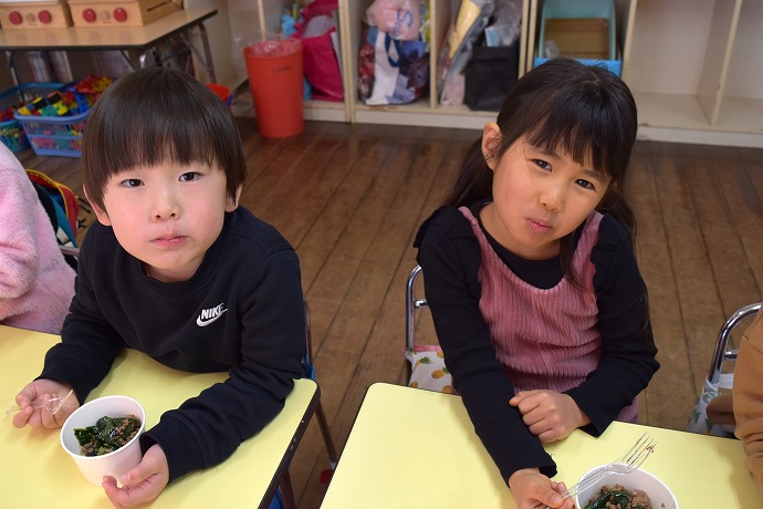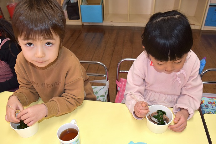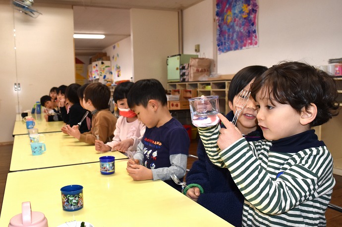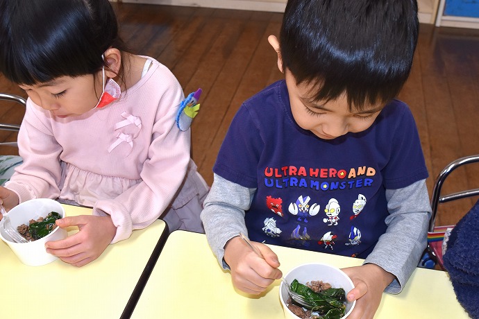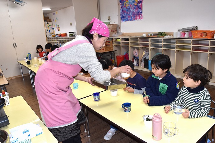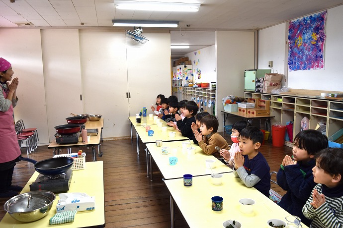 三回おかわりした人もいて、大きなお鍋二つにたっぷり作りましたが、お当番さんが園長室に届けてくれたものを除いて本当にすっかり平らげてしまった子ども達でした~!