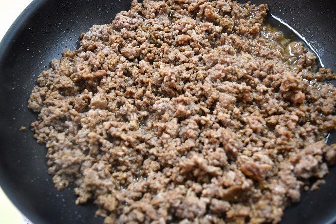 さて、フライパンではごま油をひいて挽き肉をすべて炒めます!「いいにおいがしてきたよ~!」と一仕事を終えて休憩する子ども達。