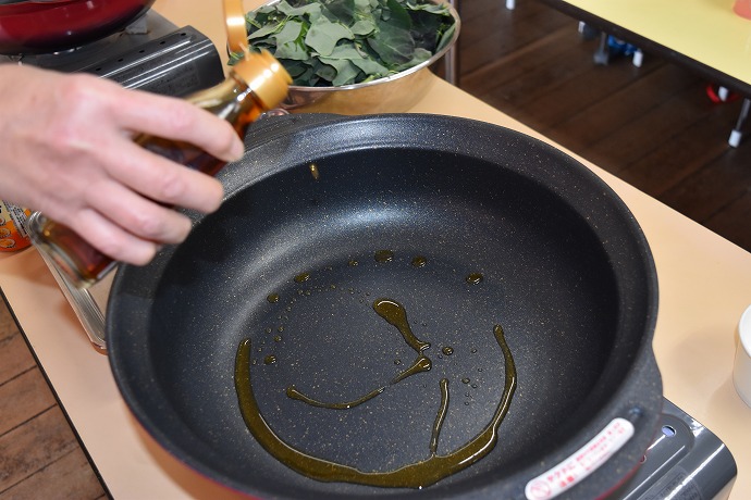 さて、お隣りのお鍋もごま油をひいて…