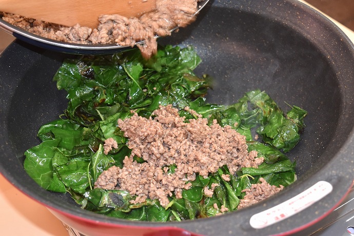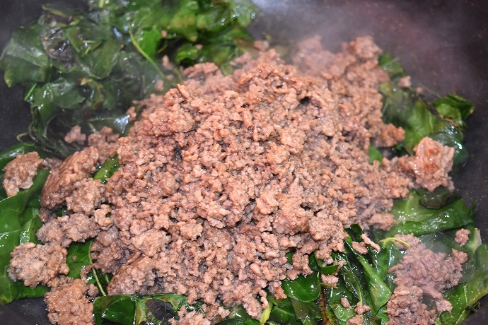 お味付け済みの挽き肉を半分ずつ葉っぱ🌿のお鍋の中へ入れ…