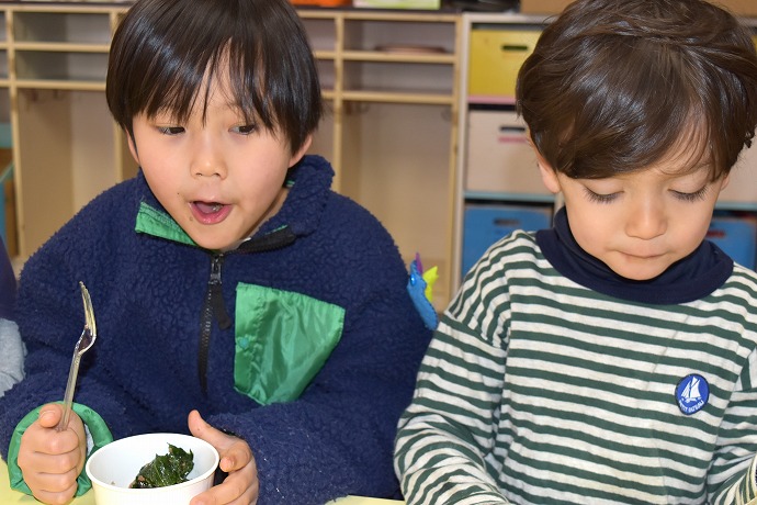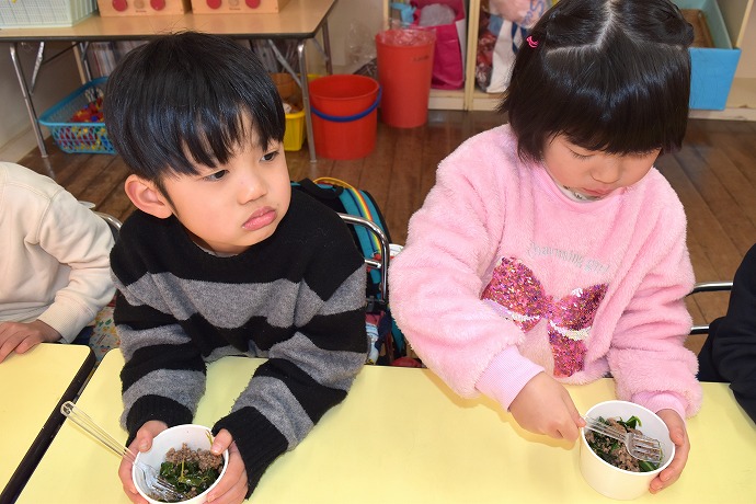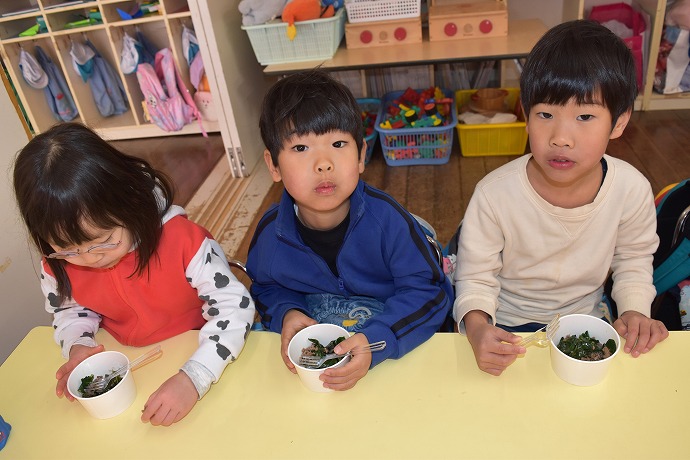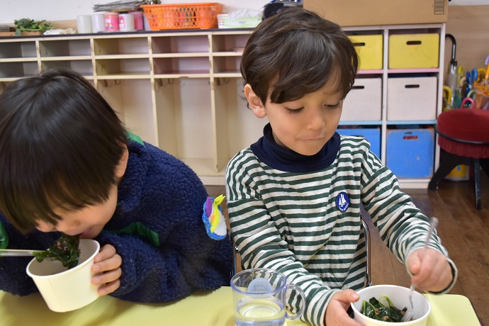 クラスは早く食べたい✨の大合唱でしたが、いよいよみんなで作ったブロッコリーの葉っぱ🌿をいただきます✨