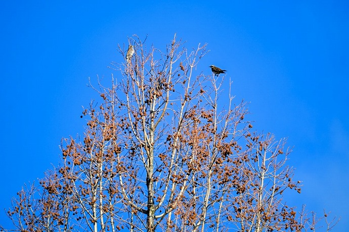 💡よく見ると右にいるオスのつぐみの左にも鳥が見えます。メタセコイアのてっぺんはいつもはカラスがとまる場所ですが、今日はどうやらツグミのメスも一緒だったようです😊