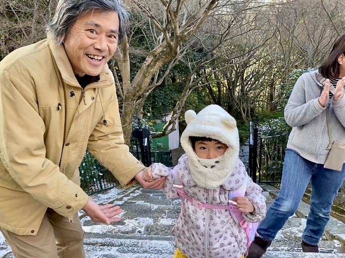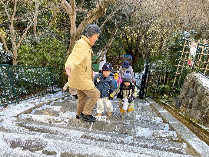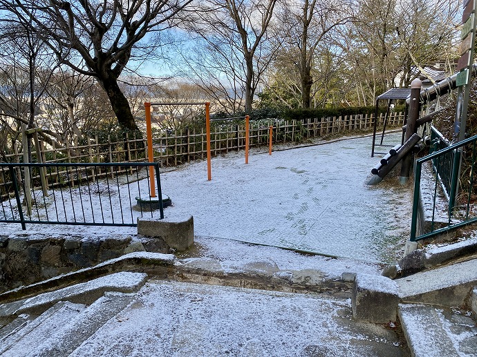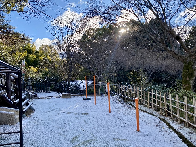 石段や園内もうっすら白い雪。