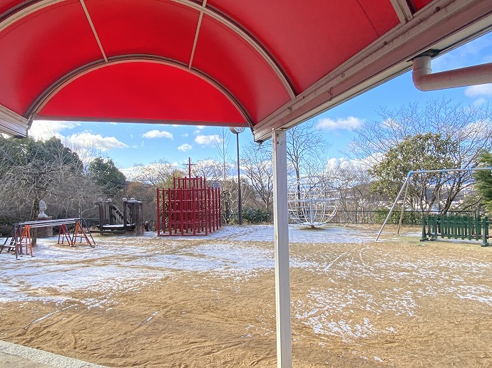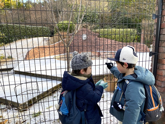 🦁ライオンさんにもうっすら、築山も雪が見えます。