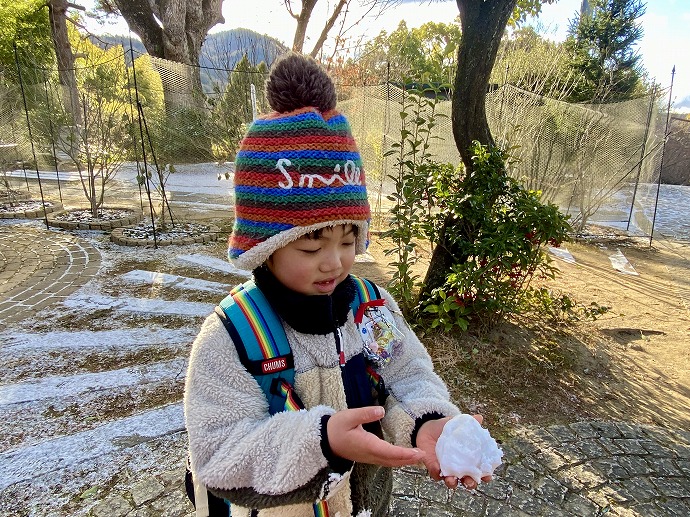 雪玉を手にしばしお話タイム。