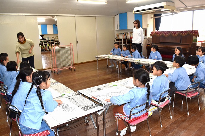コの字に座り説明に耳を傾けます。この日はインターンシップの学生さん(卒園児さん)にも同席していただきました。