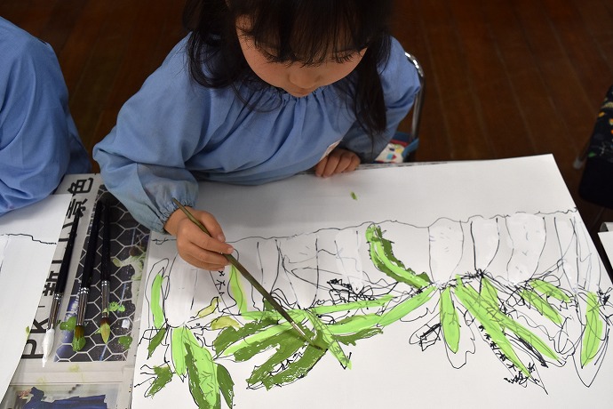 「この前のペン描きの続きが完成したら、大根の葉、実を筆で描きます。筆の絵の具がつき過ぎないように、パレットで水分を落としながら描きましょう。」