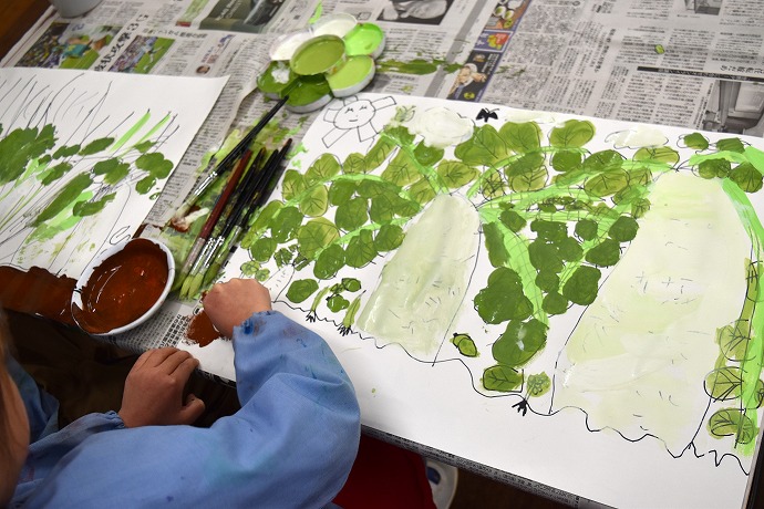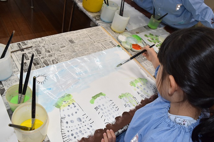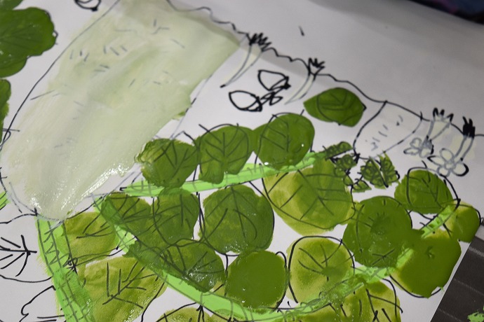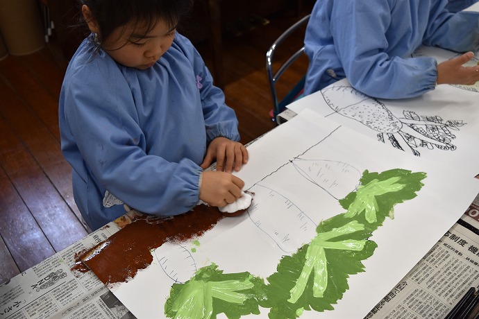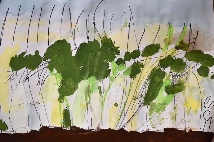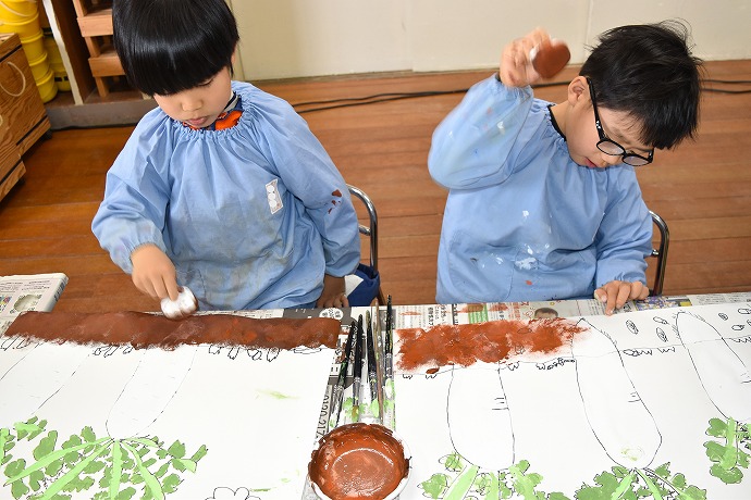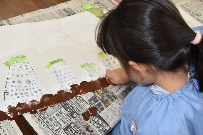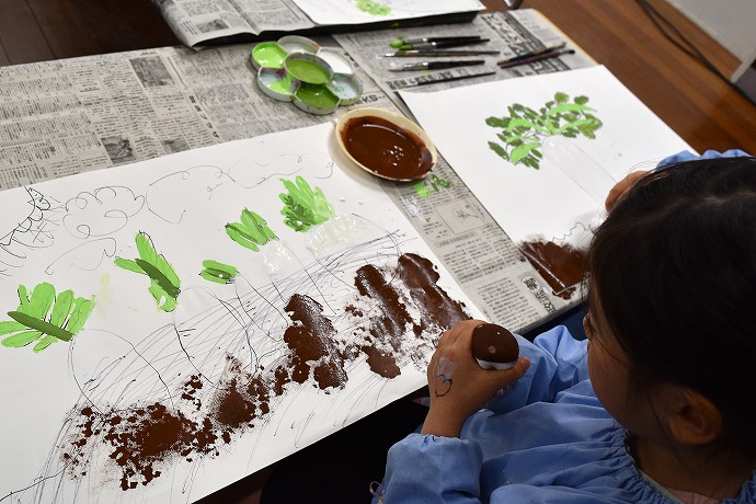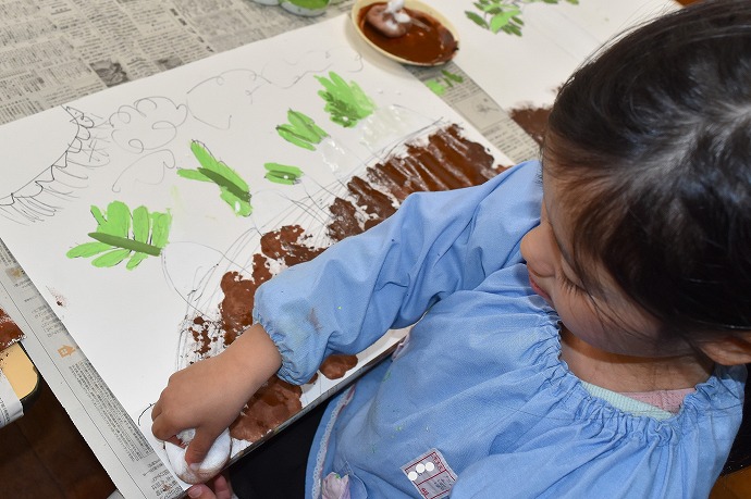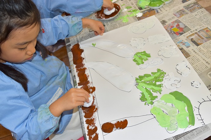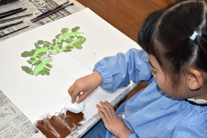 「つづいて畑の土をタンポで描いて仕上げます」