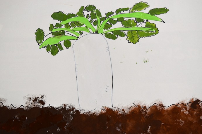 「先生はこんな感じで描いてみました。こっちに描いたこんなに小さな大根よりも、まずは一本、大きな大根を描いてみましょう」