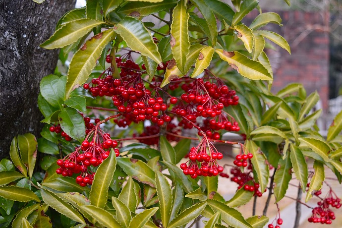 これは、ひみつの庭前のモチノキの足元に、昔から自生している”マンリョウ(万両)”の実。花言葉は「寿ぎ(ことほぎ)」などで縁起のよい日本古典園芸植物の一つです。江戸時代から育種、改良され日本独自の発展をしてきた植物なので、冬の今たわわになる赤い実をみんなで大切に観ています。園長室のナンテンは今たわわになっていますが野鳥がしがみついて食べるのでひどく散在していますが、マンリョウは葉の下にそっと下向きに生えているので食べにくいためか実が長く残ります。やがてヒヨドリ、ツグミ、メジロ、シロハラなどお山の野鳥がやってきて食べるでしょう✾