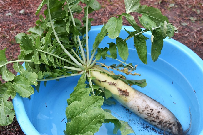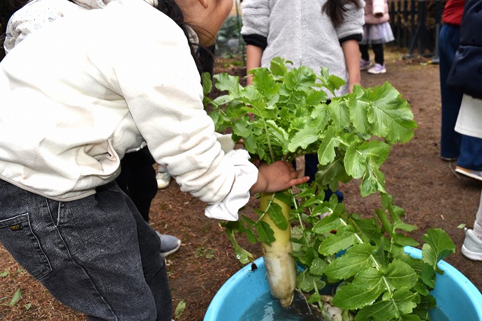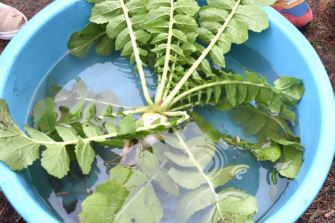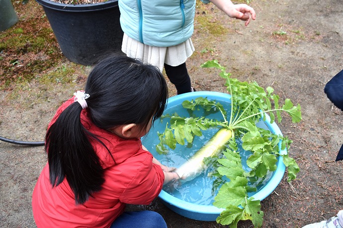 手がつめたいよ~🌿 収穫した大根を洗います。