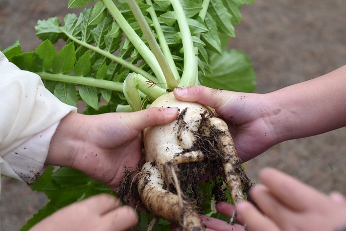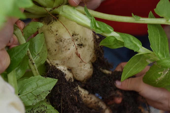 今日は残りすべての野菜を収穫して調理をします。よいしょ!と一緒に持ち上げて引き抜くことができました。