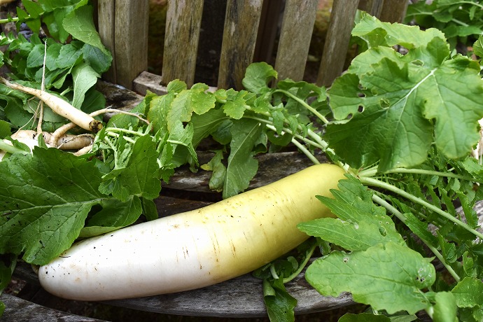 カラスは高い場所からみんながすることをよく見ていて、夏のきゅうりを収穫してひみつの庭のテーブルでみんなで美味しく食べた日の午後は、同じようにきゅうりを自分で取ってきて、同じテーブルの上で真似て食べていたりします。ただ今回は、大根の味には苦味もあったのか口には合わなかったのだと思われます。少しの被害で済んだのは幸いでした💦