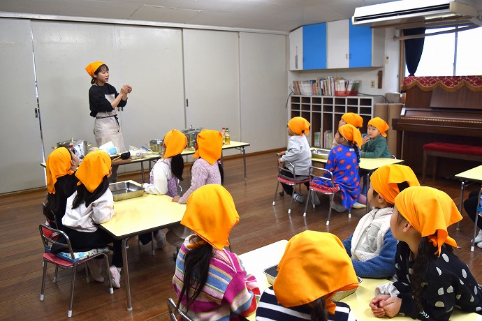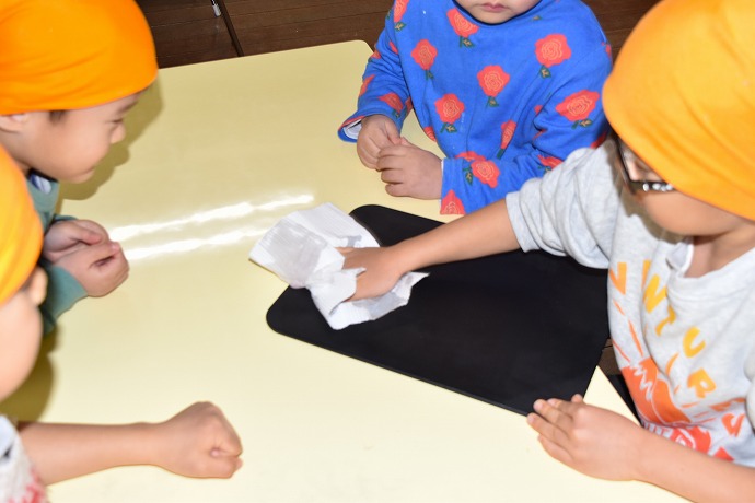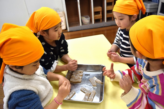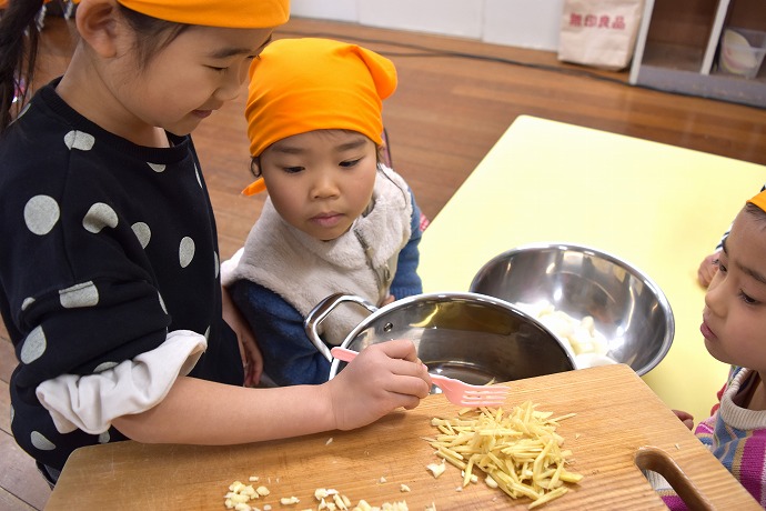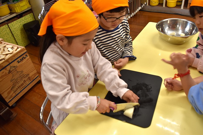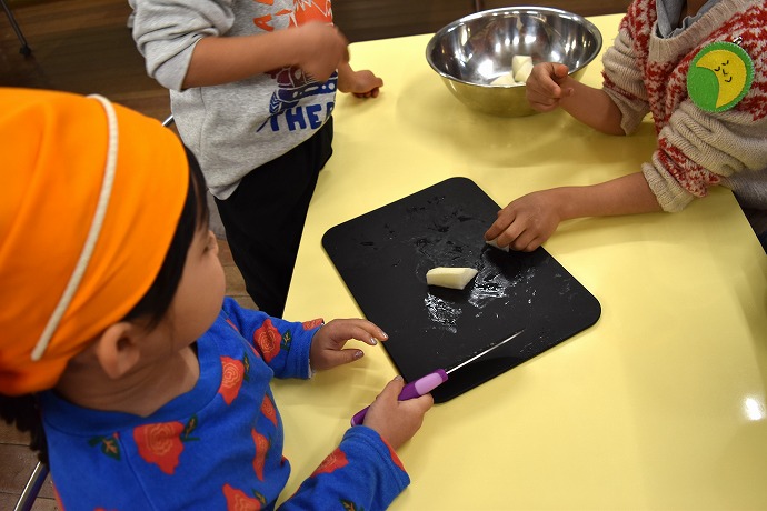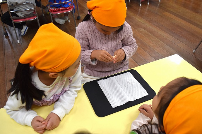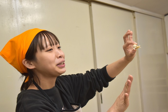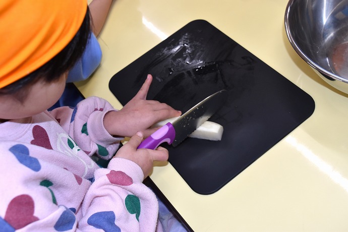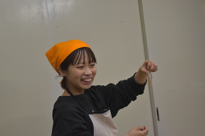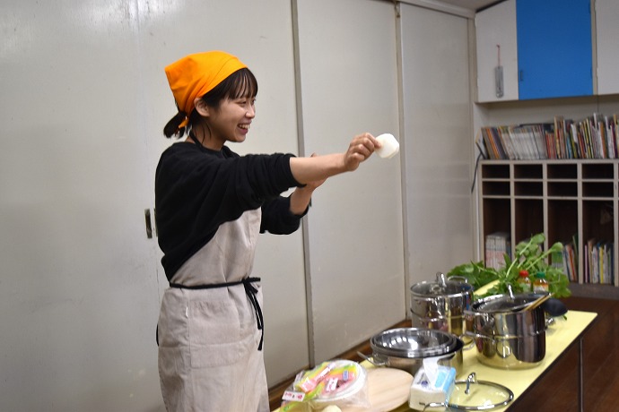 三角巾をつけて準備オーケー。今日はいくつものメニューをみんなで協力して作っていきます。最初はおでんに入れる「むすびこんにゃく」をみんなにつくってもらいますよ~。