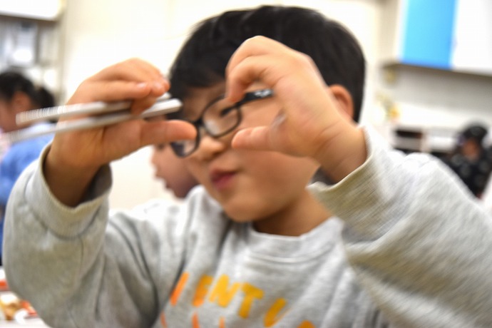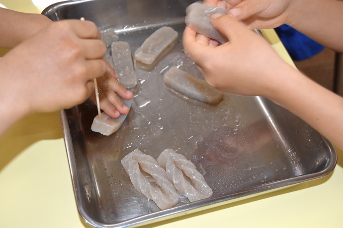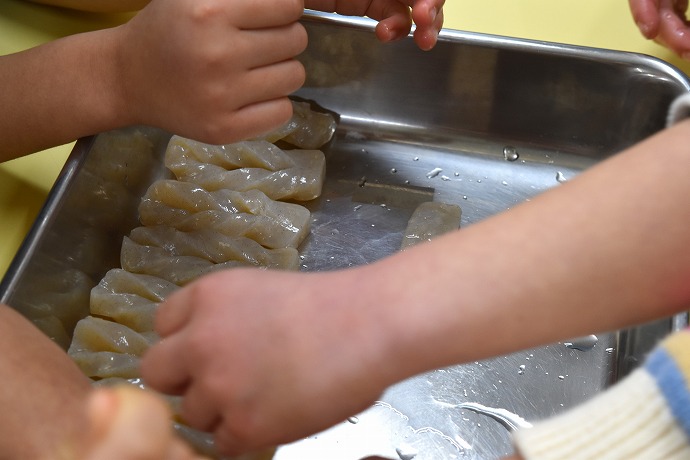 くるりん!と切った筋の中に丸めて入れるとこの通り! さて、みんなも目の前のこんにゃくでお願いします!
