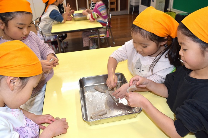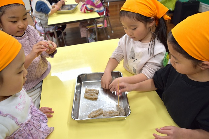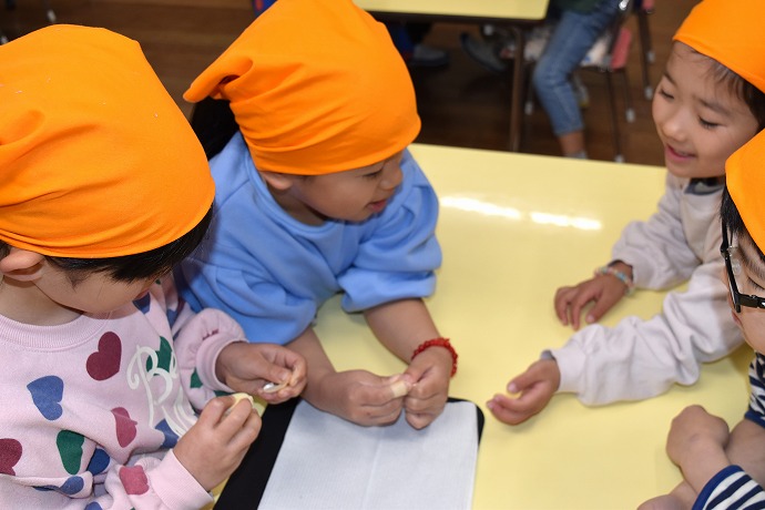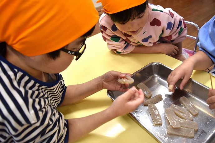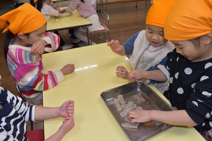 これ何かみんなは知ってるかな? 見たことあるよね。これは”ひろうす”と言います。おでんに入れるととても美味しいよね!あとで入れますね!
