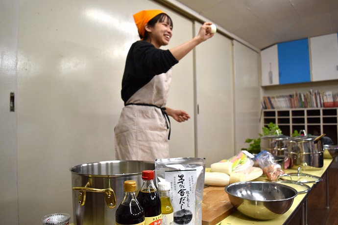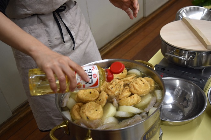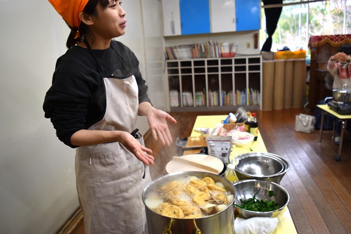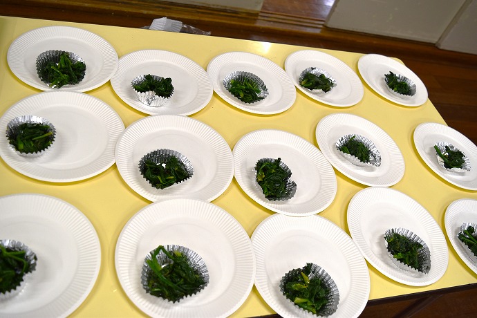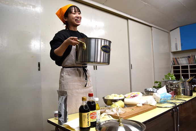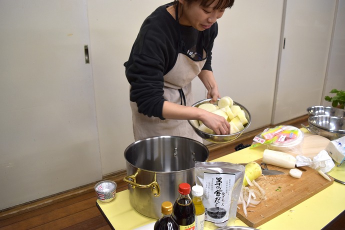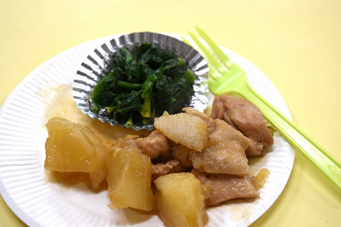 今日は明日までお味をしみ込ませるための”おでん”の仕込み、そして本日いただく”鶏肉と大根の煮込み””ちぢみほうれん草の和え物”の三品を一度に、しかもみんなで分担して力を合わせて作り上げた満足感が溢れているようでした。