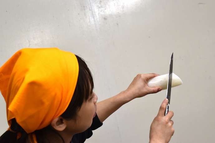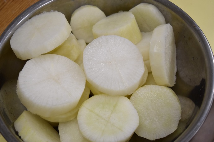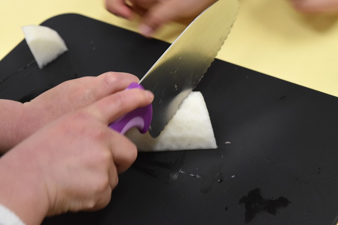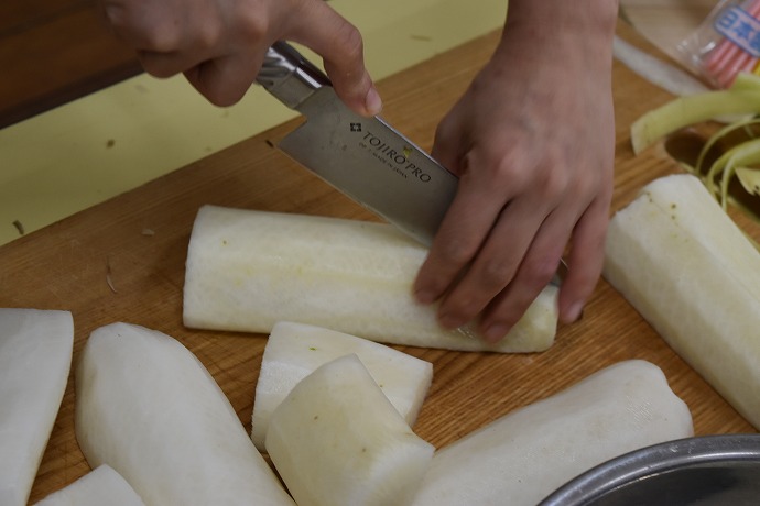 では、大根をお味が中に染み込み易いようにこのように三角にカットしますよ。”乱切り”という切り方をします。