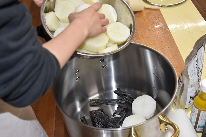 それでは大根投入~。結び昆布は後で食べられるので予定していましたが、普通の切り出し昆布に変更です👆